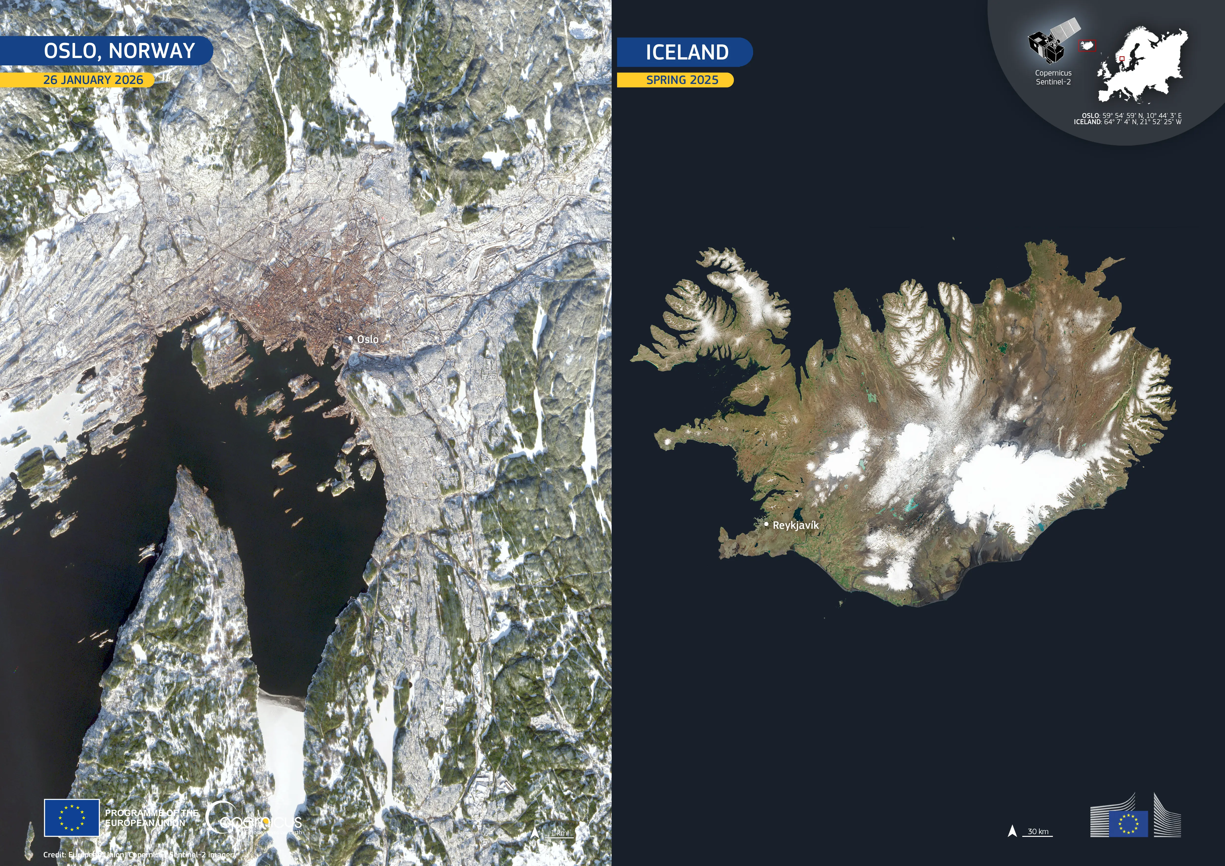 In the Copernicus Sentinel-2 image on the left, acquired on 26 January 2026, Oslo appears largely snow-covered, while the dark waters of the fjord clearly outline the city and its harbour. On the right, a Sentinel-2 mosaic of Iceland, produced using data from spring 2025, shows broad expanses of bare soil in brown and vegetation in green, with areas covered in snow and ice, including the Vatnajökull ice cap in the southeast.