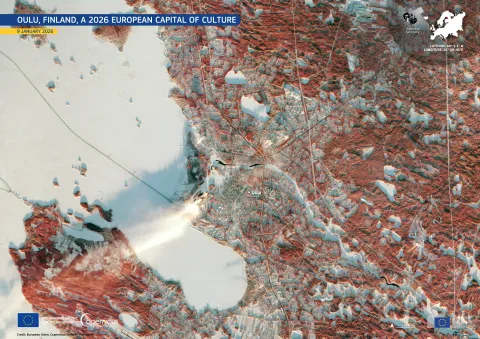 In addition to Trenčín, Slovakia, Oulu, Finland has been awarded the title of European Capital of Culture in 2026, thanks to its dedication to fostering a “Cultural Climate Change” to address global challenges. Located in northern Finland, Oulu is known for its strong technology sector, innovative cultural scene, and close connection to nature along the Gulf of Bothnia. The city is visible in this Copernicus Sentinel-2 false-colour image acquired on 9 January 2026.