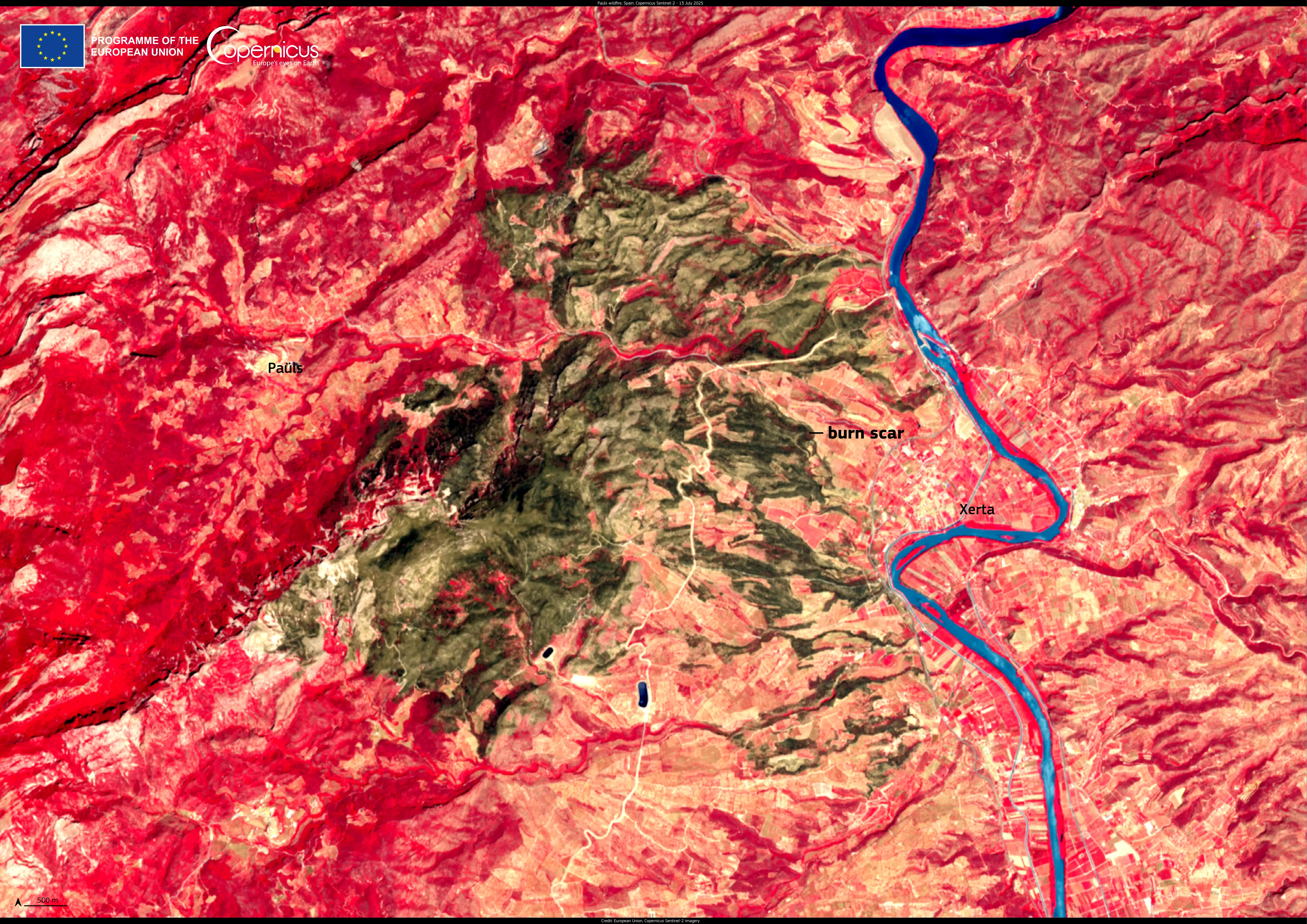 This Copernicus Sentinel-2 image, acquired on 13 July 2025, shows the extent of the burn scar left by the fire.