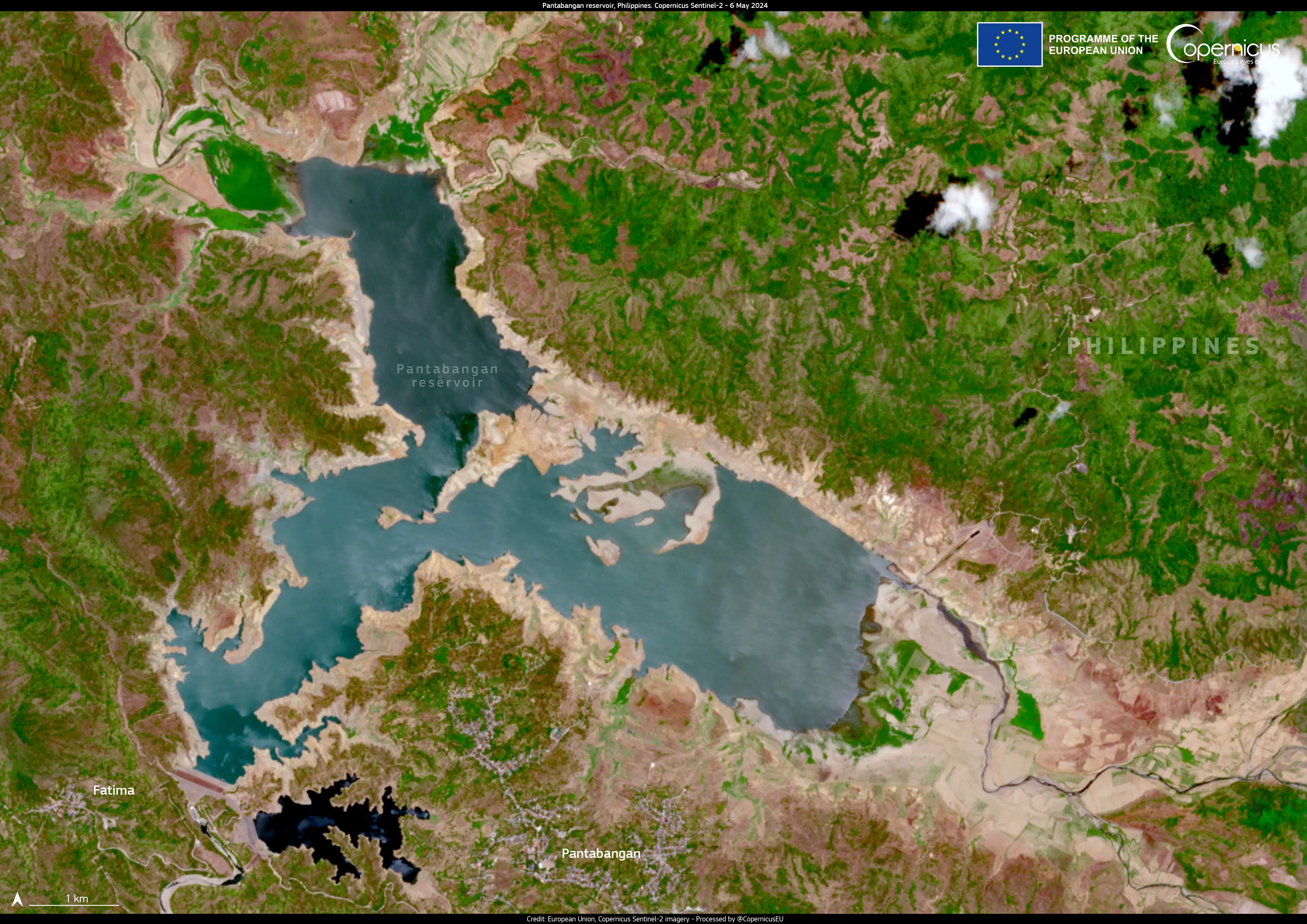The Pantabangan Reservoir, one of the country's largest, has reached critical levels. As seen in this image captured by one of the Copernicus Sentinel-2 satellites on 6 May, the water level has dropped 26 metres this year alone, exposing the ruins of a centuries-old city that had been submerged since the 1970s as as result of the dam's construction.