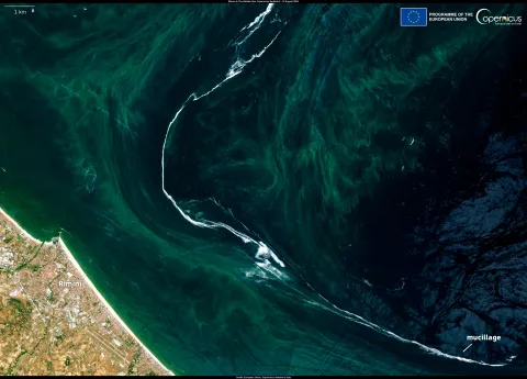 The bloom has also led to the formation of mucilage, which has accumulated along the coasts of some Italian regions bordering the Adriatic Sea. This image, acquired by one of the Copernicus Sentinel-2 satellites on 10 August 2024, shows both the mucilage (in white) and the phytoplankton bloom (in green) off the coast of the city of Rimini.
