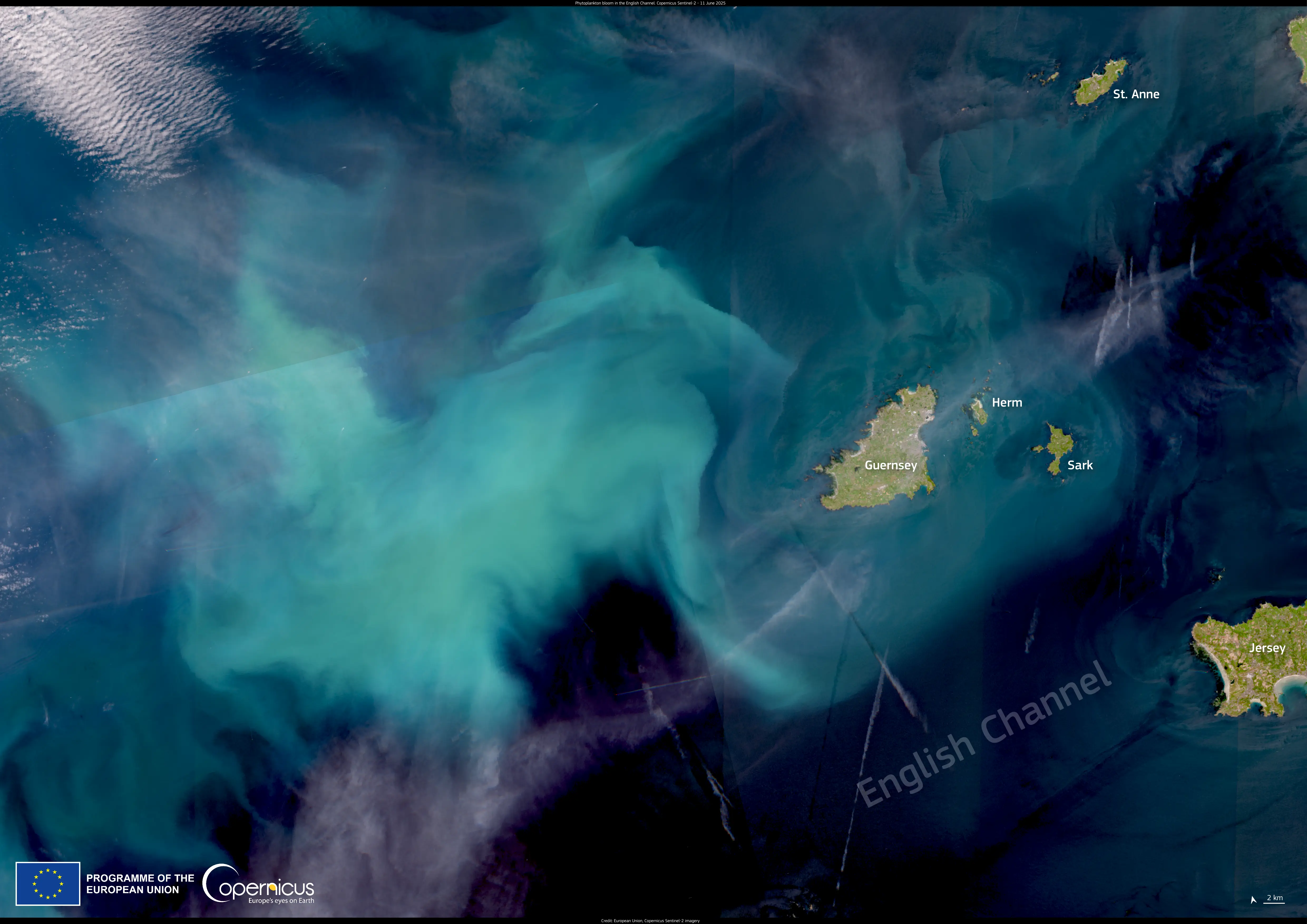 Phytoplankton blooms occur almost every spring in the English Channel, driven by a combination of environmental factors which converge during the seasonal transition. As daylight hours increase and surface waters warm, nutrient inputs from terrestrial runoff and wind-driven vertical mixing create optimal conditions for microalgal growth in the sunlit upper layers of the water column. These blooms play a key role in marine ecosystems, forming the base of the food chain and influencing biogeochemical cycles. This image, acquired by one of the Copernicus Sentinel-2 satellites on 11 June 2025, shows a large phytoplankton bloom near the island of Guernsey, where strong tidal currents and vertical mixing promote nutrient upwellings.