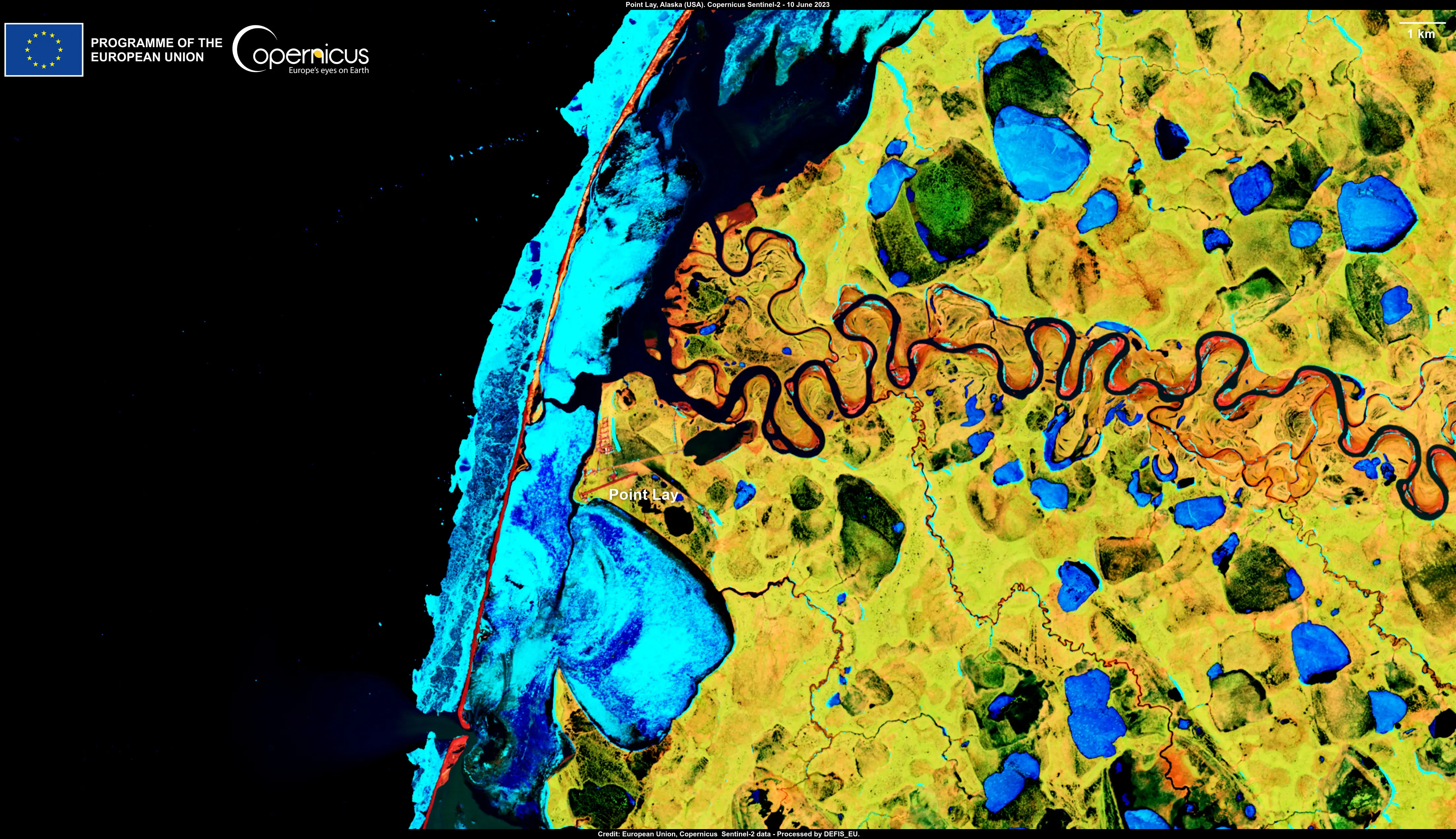 This image, acquired by one of the Copernicus Sentinel-2 satellites on 6 June 2023, shows the coastal town of Point Lay in Alaska, USA.