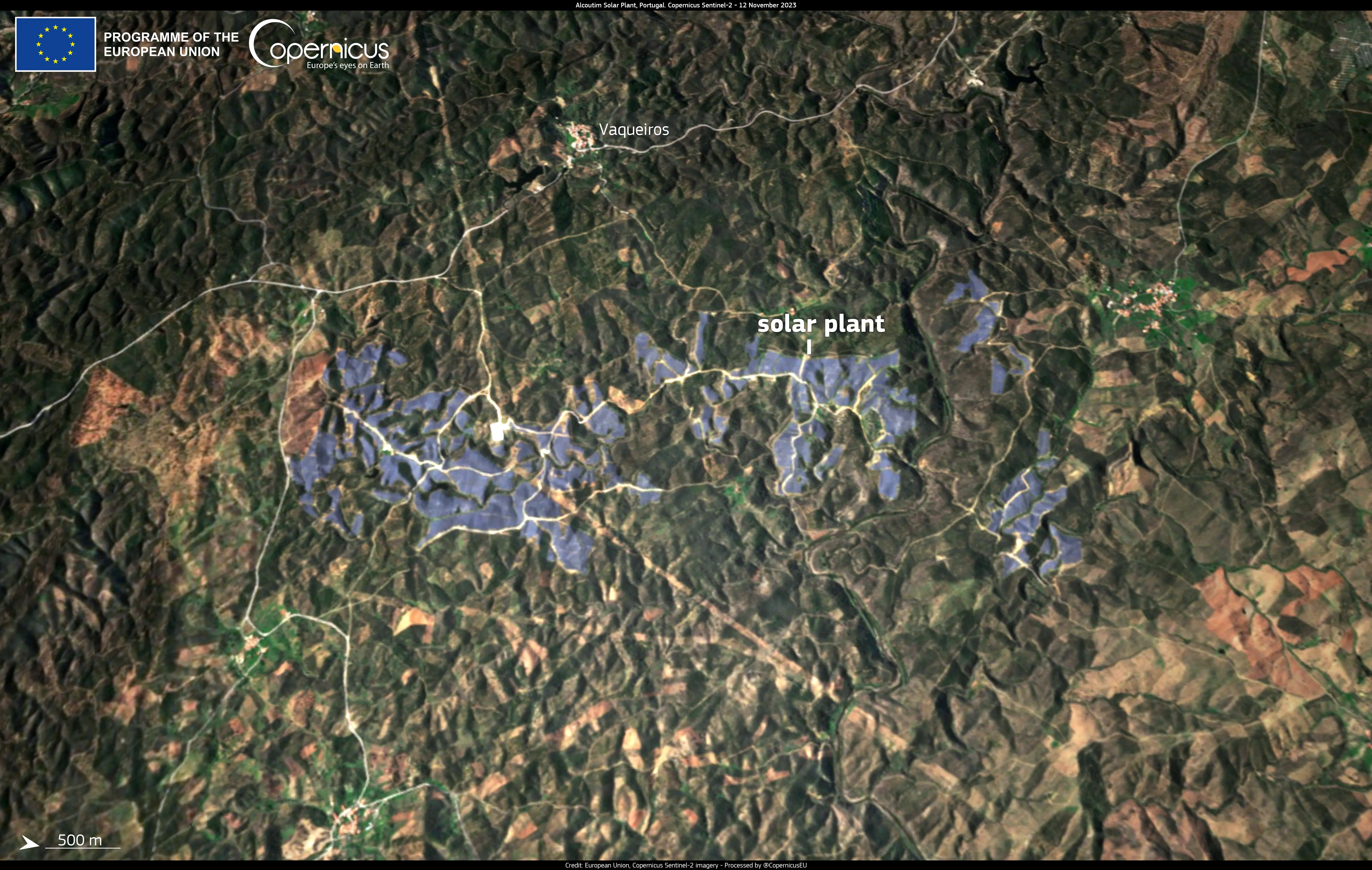 Portugal is at the forefront of the renewable energy sector. This image acquired by one of the Copernicus Sentinel-2 satellite on 12 November shows the solar plant of Alcoutim, the largest of the country.