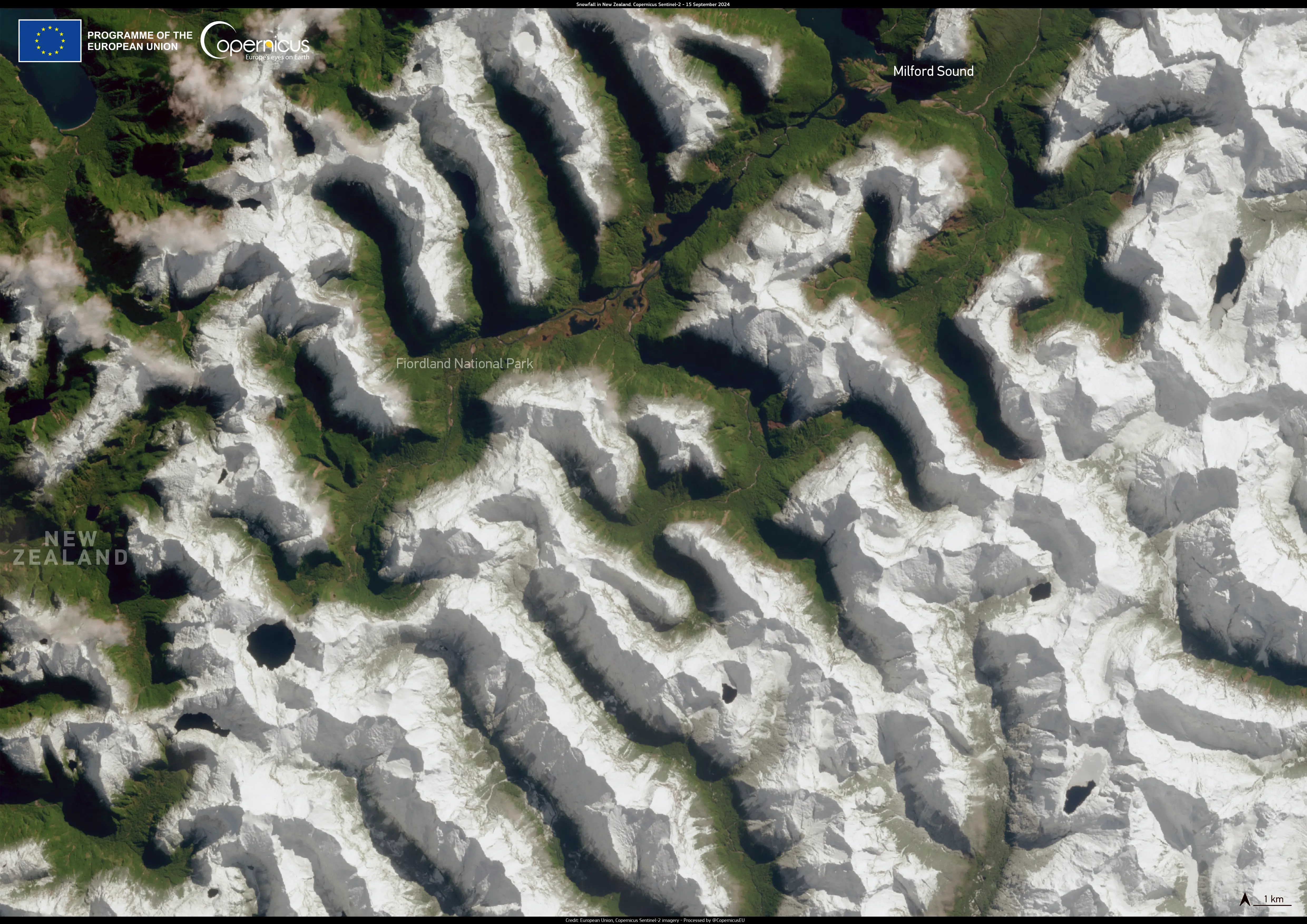 This Copernicus Sentinel-2 image acquired on 15 September 2024 shows the snow-capped mountains of Fiordland National Park near Milford Sound in Southland, New Zealand.