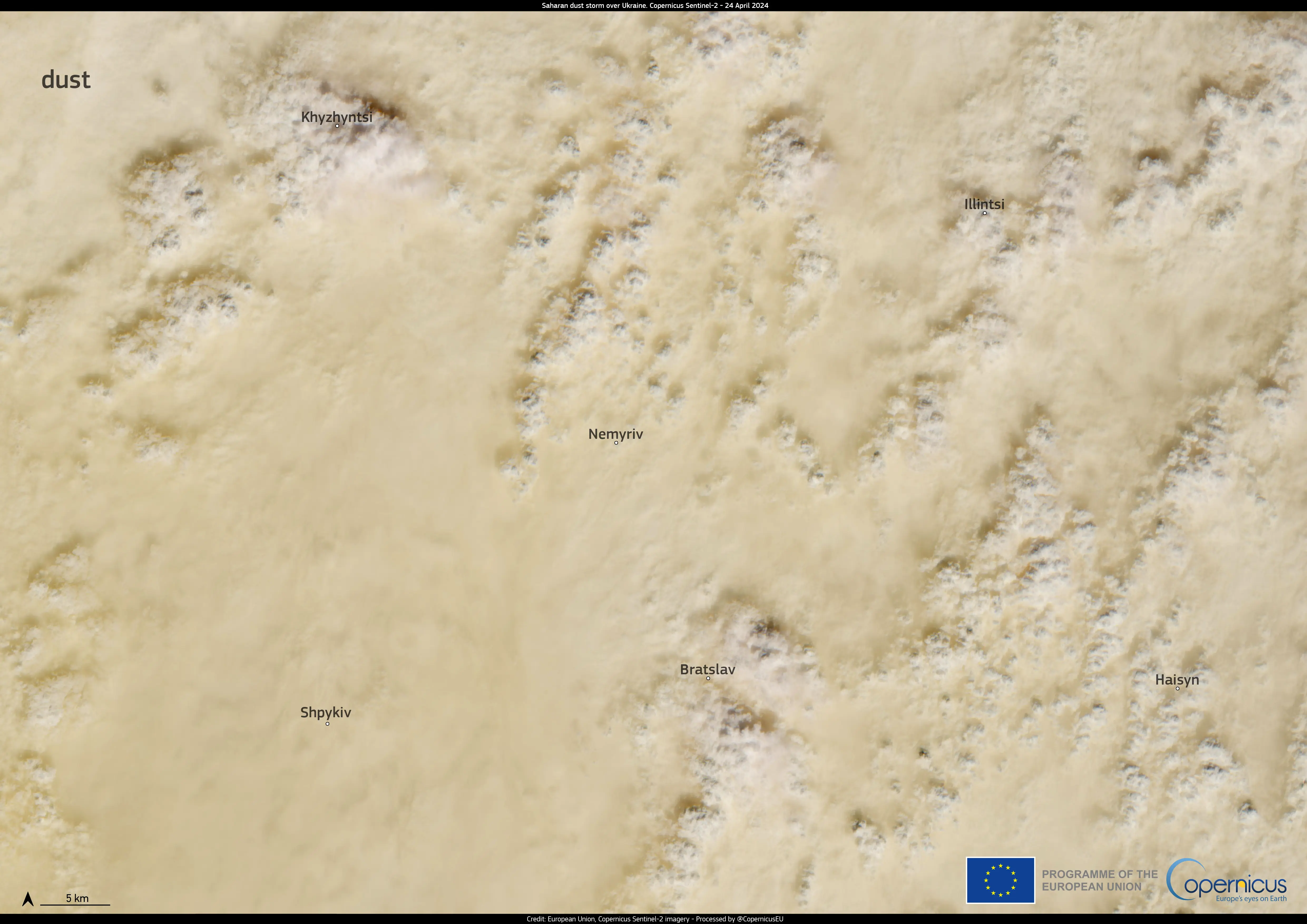 Dust hovering over Ukraine is visible in this Copernicus Sentinel-2 image acquired on 24 April.