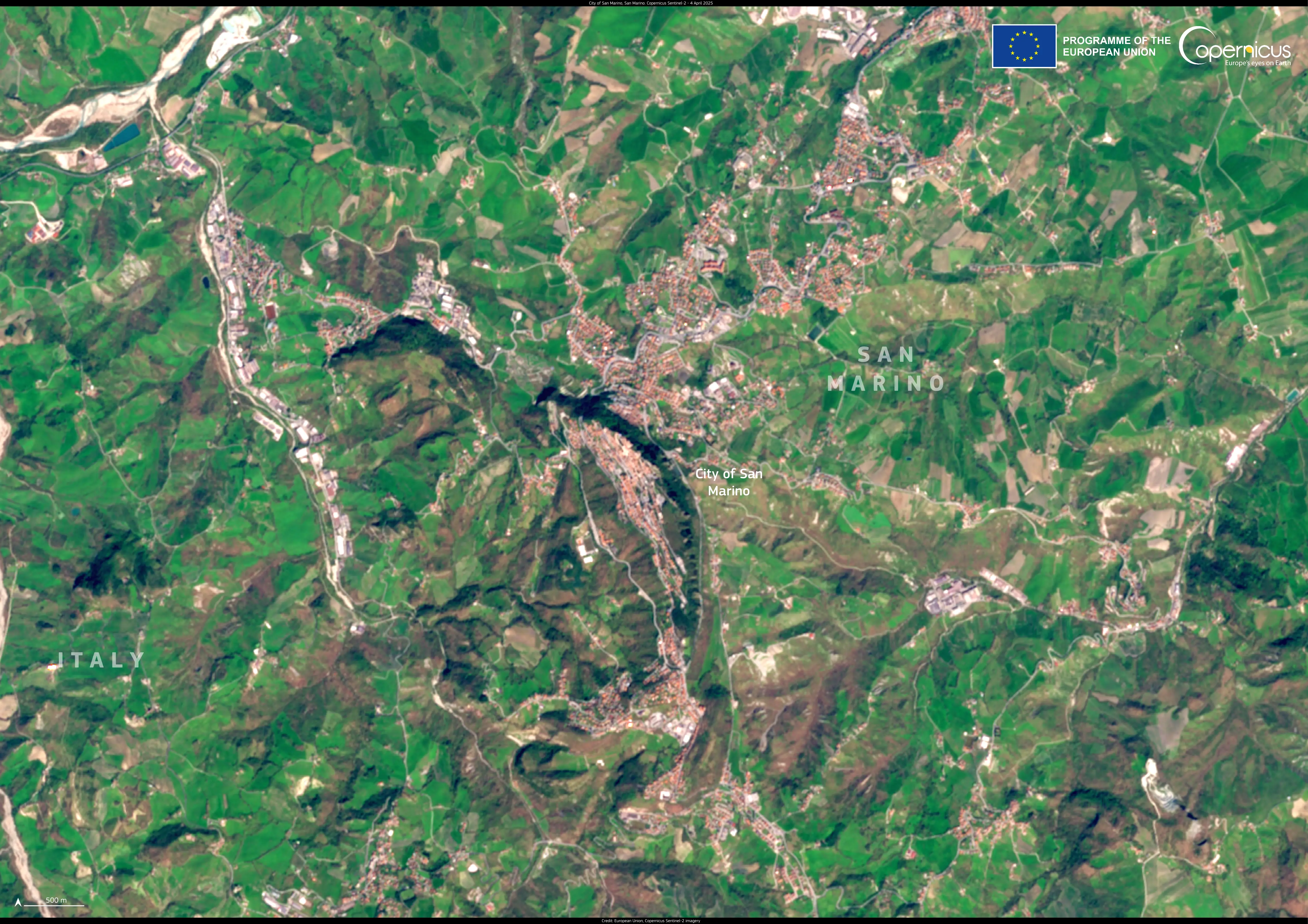San Marino and its capital, the City of San Marino, are visible in this Copernicus Sentinel-2 image acquired on 4 April 2025.
