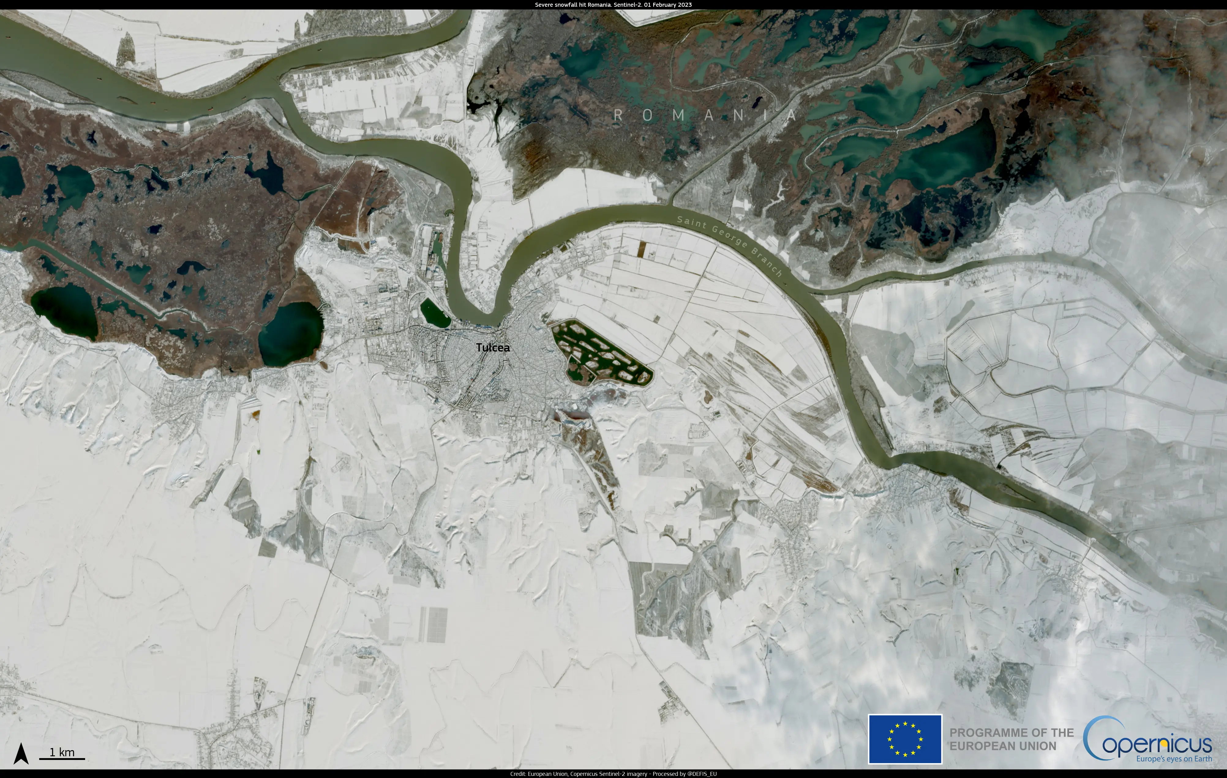 Over 30,000 people were left without electricity, and road transportation was severely impacted by snow and ice. The affected areas saw fallen trees and electricity poles, while some low-lying regions were also flooded. The local authorities have been working to clear the roads, remove debris, and evacuate the water to restore normal conditions. This image captured by one of the Copernicus Sentinel-2 satellites on 2 February 2023 provides a glimpse into the impact of the snowfall on the city of Tulcea, in the west of the country.