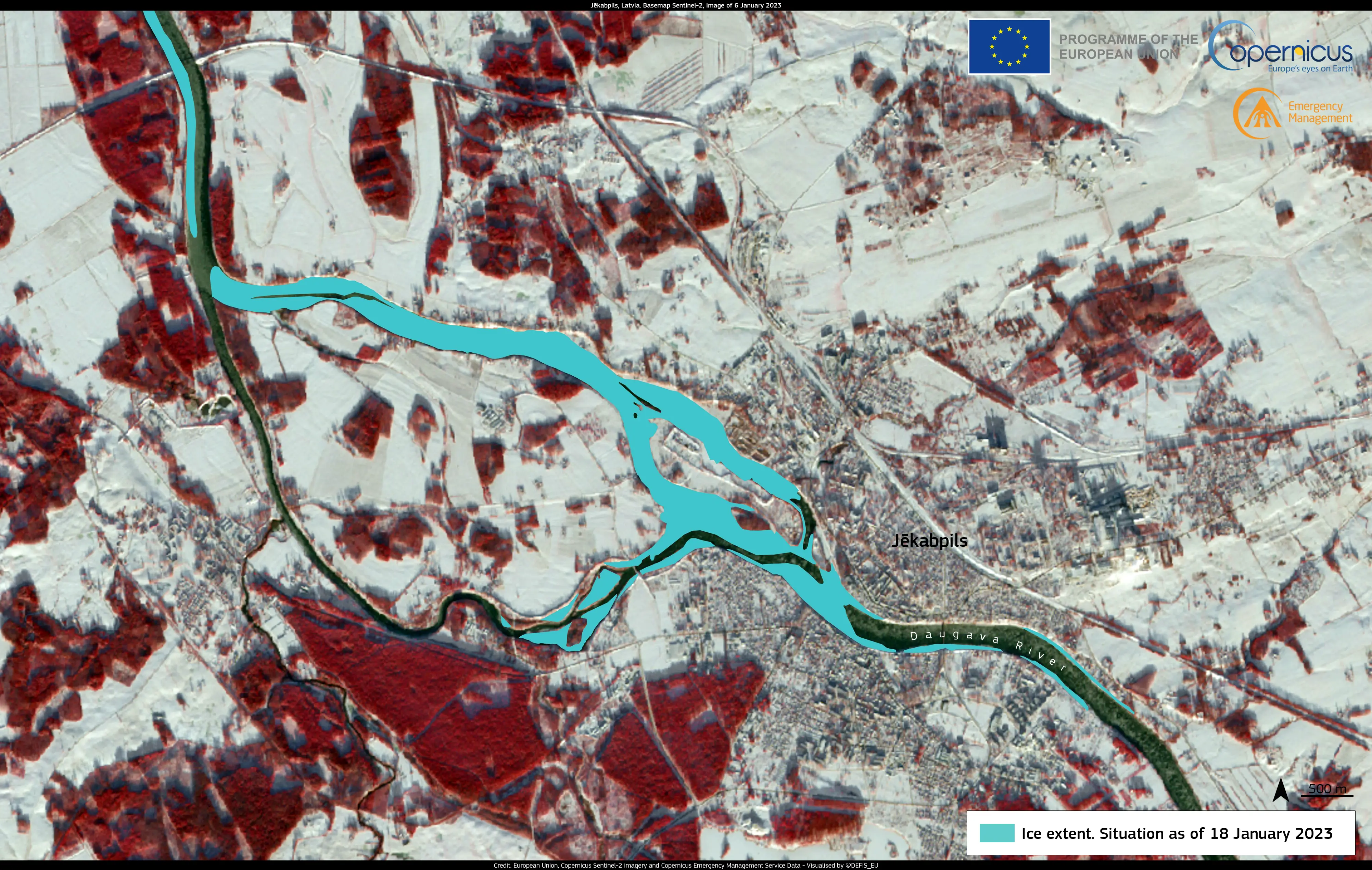 This image is a data visualisation of the CEMS product released on 18 January and highlights in blue the 803,4 ha area near the city of Jekabpils, in which the river is frozen.