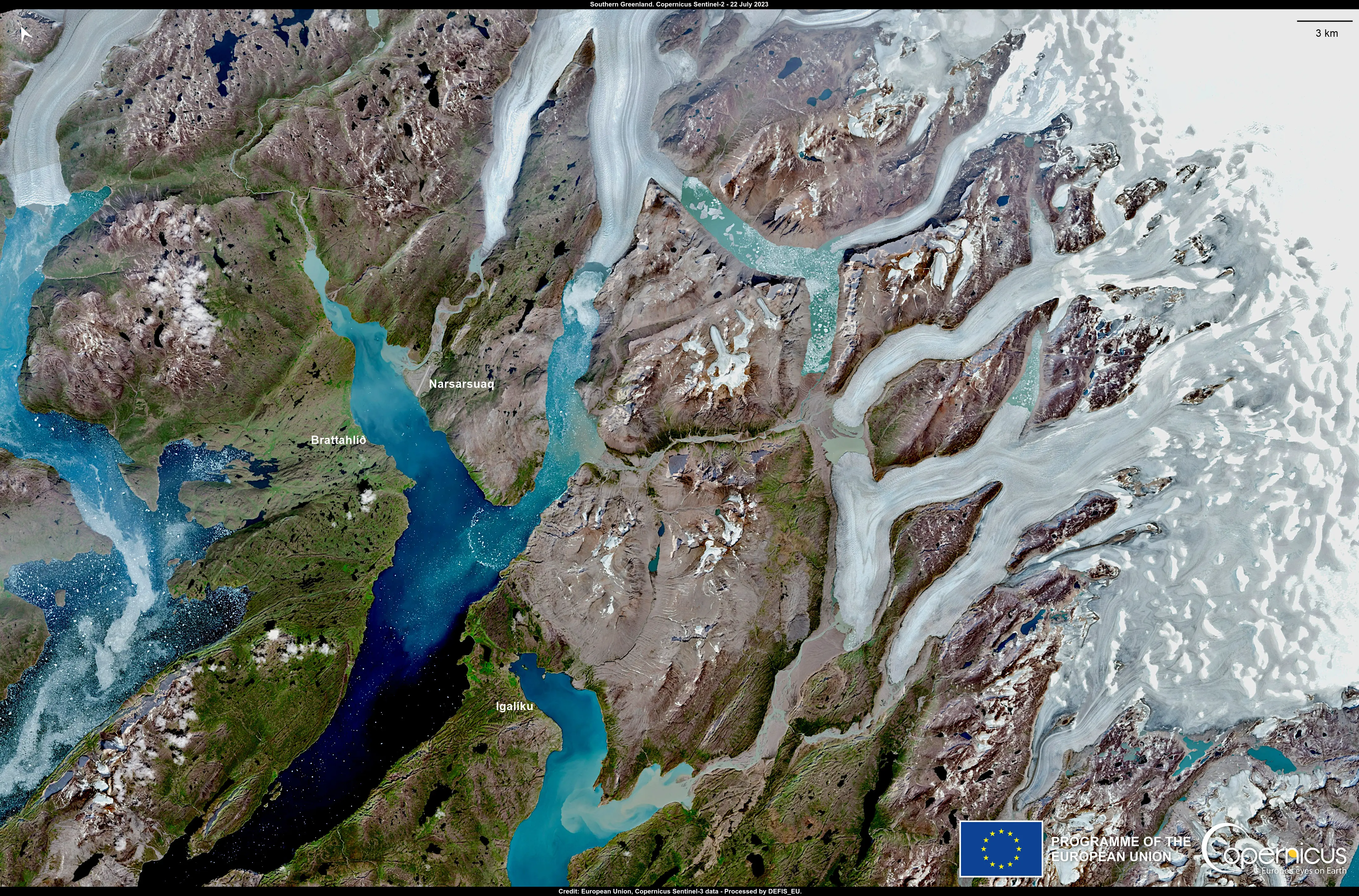 The soaring temperatures resulted in intensified snow and ice melt on the southern part of the island. This image, acquired by the Copernicus Sentinel-2 satellites on 22 July, showcases the phenomenon in the settlement of Narsarsuaq, in the province of Kujalleq.