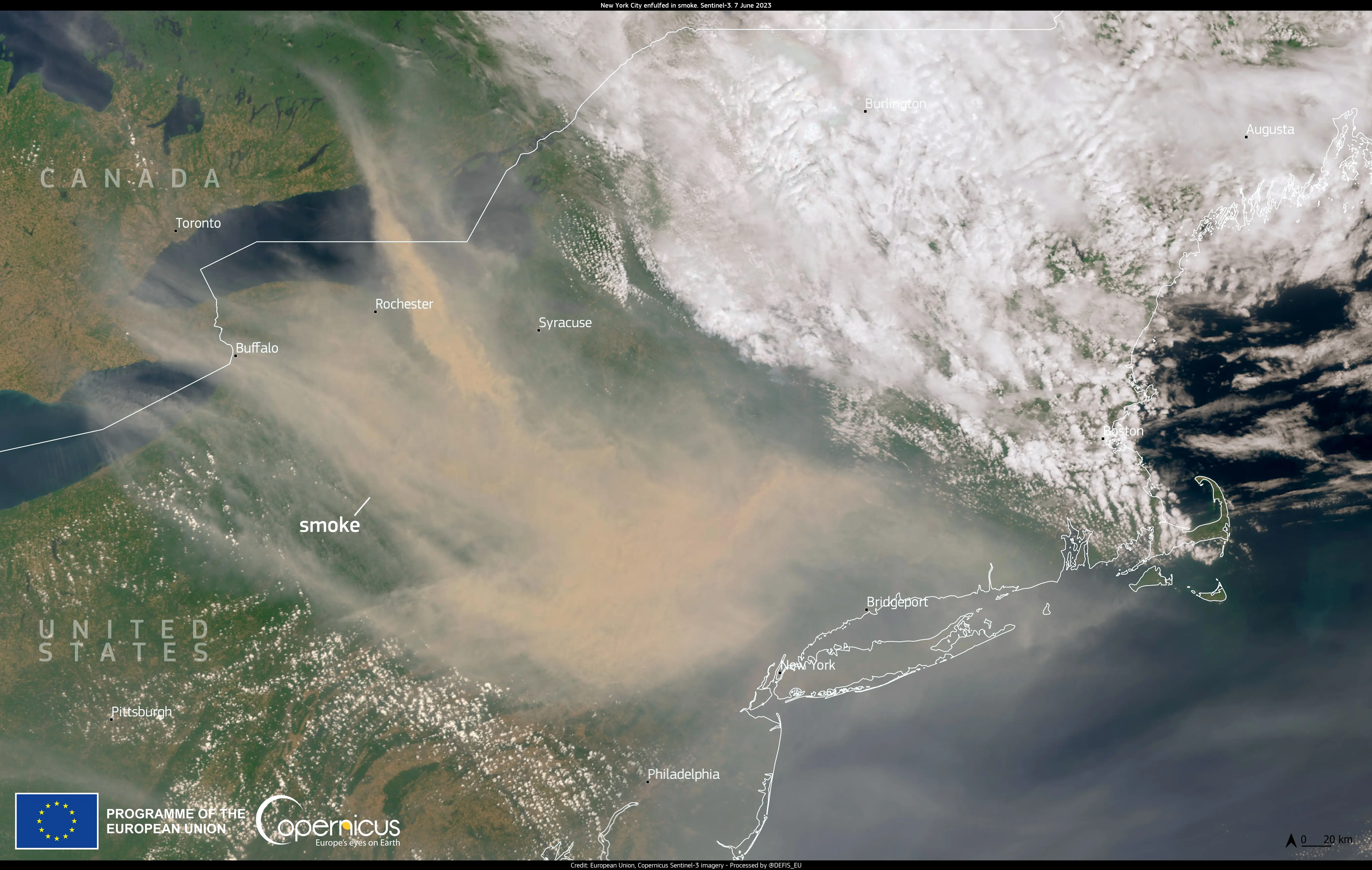 This image, acquired on 7 June 2023 by a Copernicus Sentinel-3 satellite, shows plumes from the Canadian fires reaching the American East Coast. In a region-spanning event, New York City found itself shrouded in thick smoke while Philadelphia and Washington DC declared a 'code red' emergency.