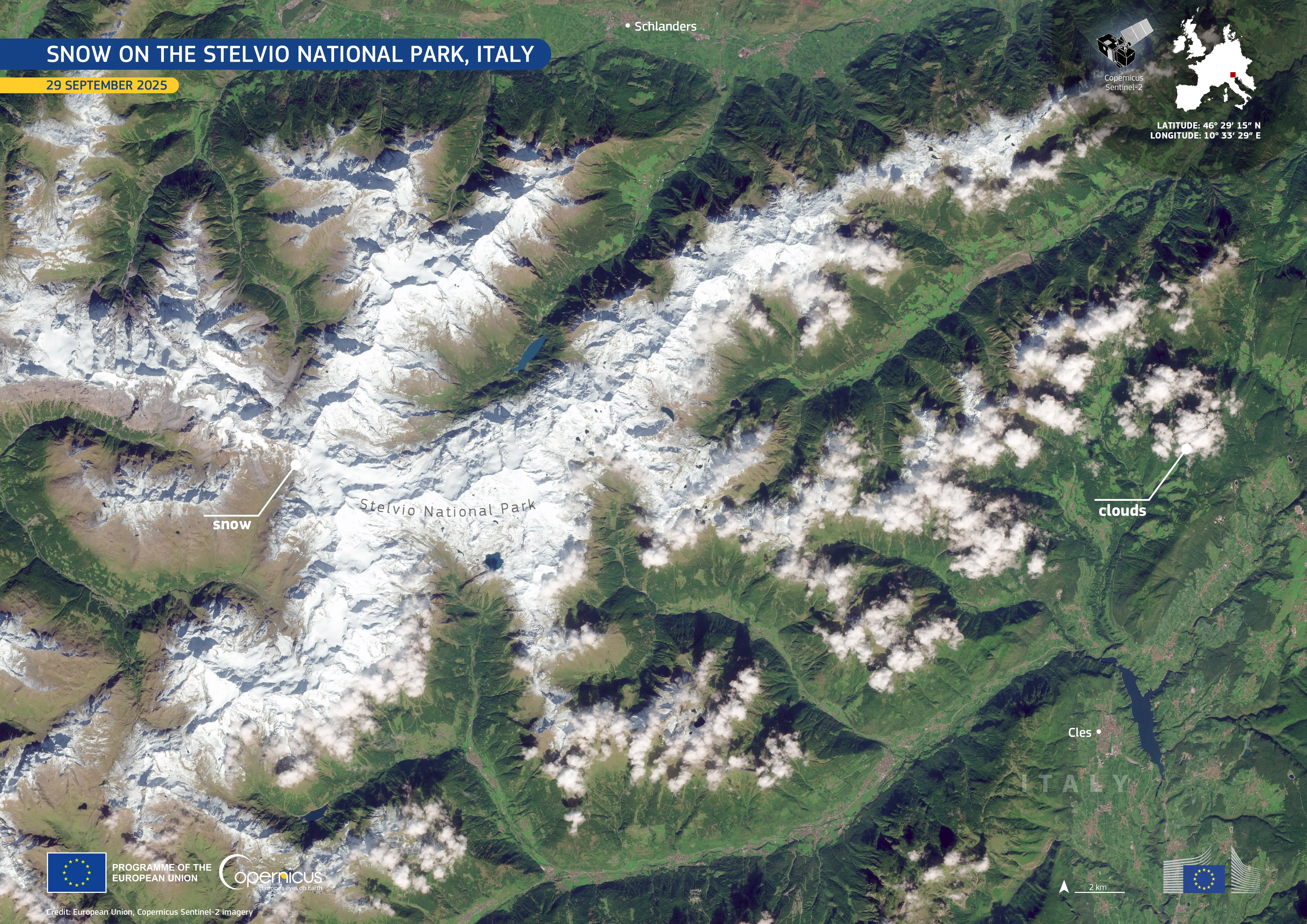 At the end of September 2025, the Stelvio National Park received its first snowfall of the season. The snow is visible in this image acquired by one of the Copernicus Sentinel-2 satellites on 29 September.