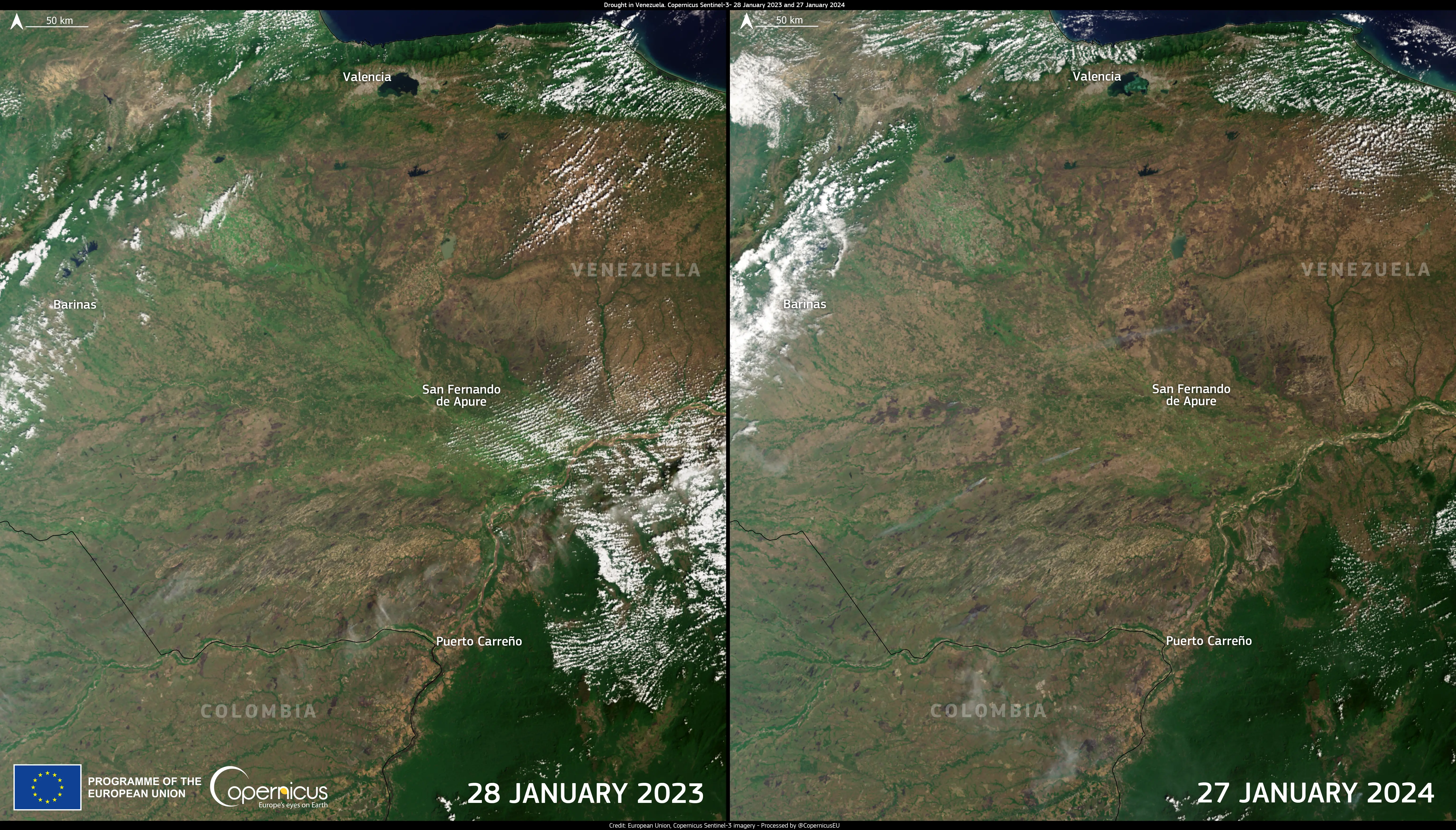 These images acquired by the Copernicus Sentinel-3 satellites on 28 January 2023 and 27 January 2024 provide evidence of the consequences of the lack of rain affecting the area of San Fernando de Apure in Venezuela.
