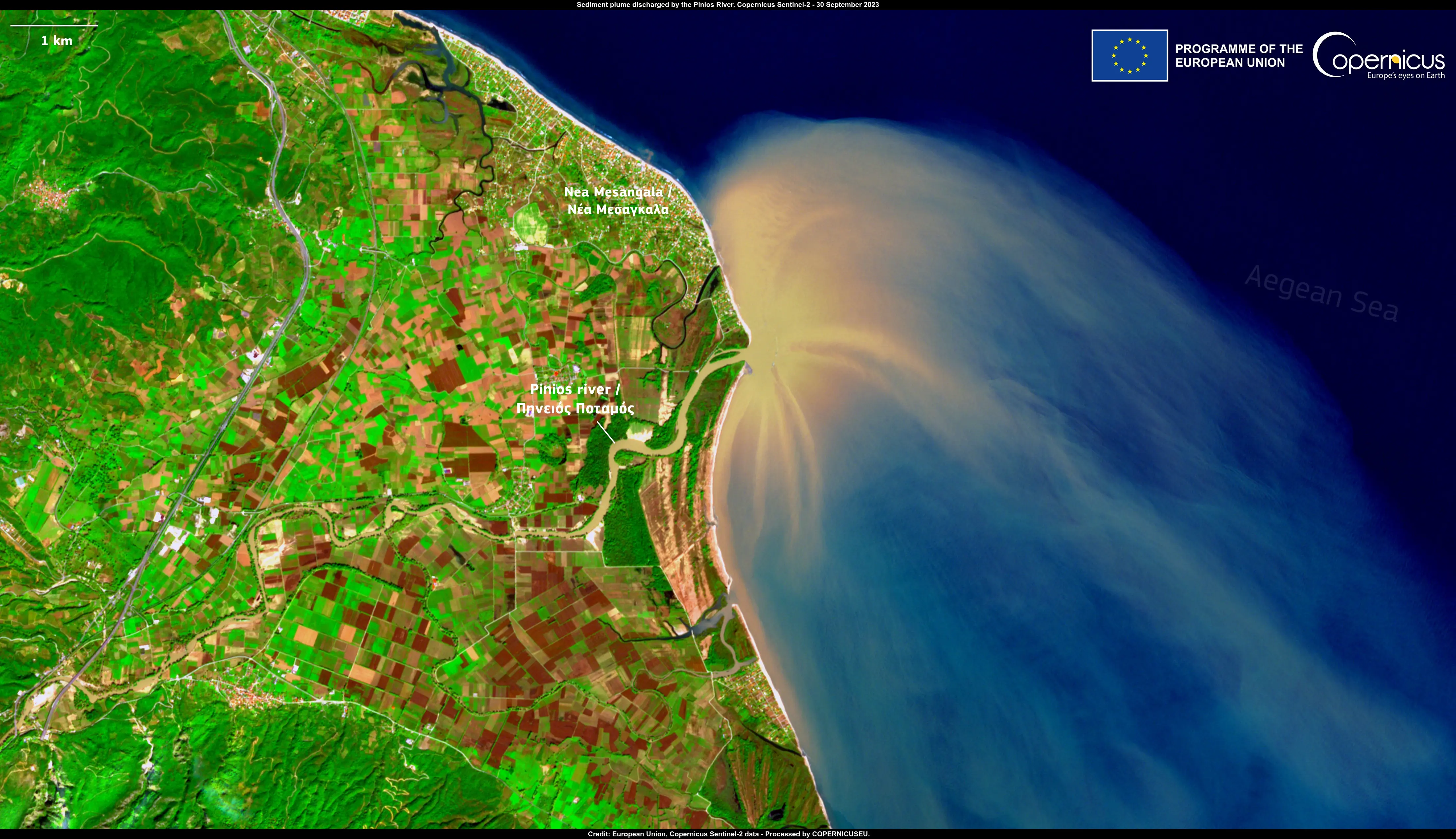 In this image, acquired by one of Copernicus Sentinel-2 satellites, the massive amount of sediment washed away by the floods can be seen as the Pino River discharges in the Aegean Sea.