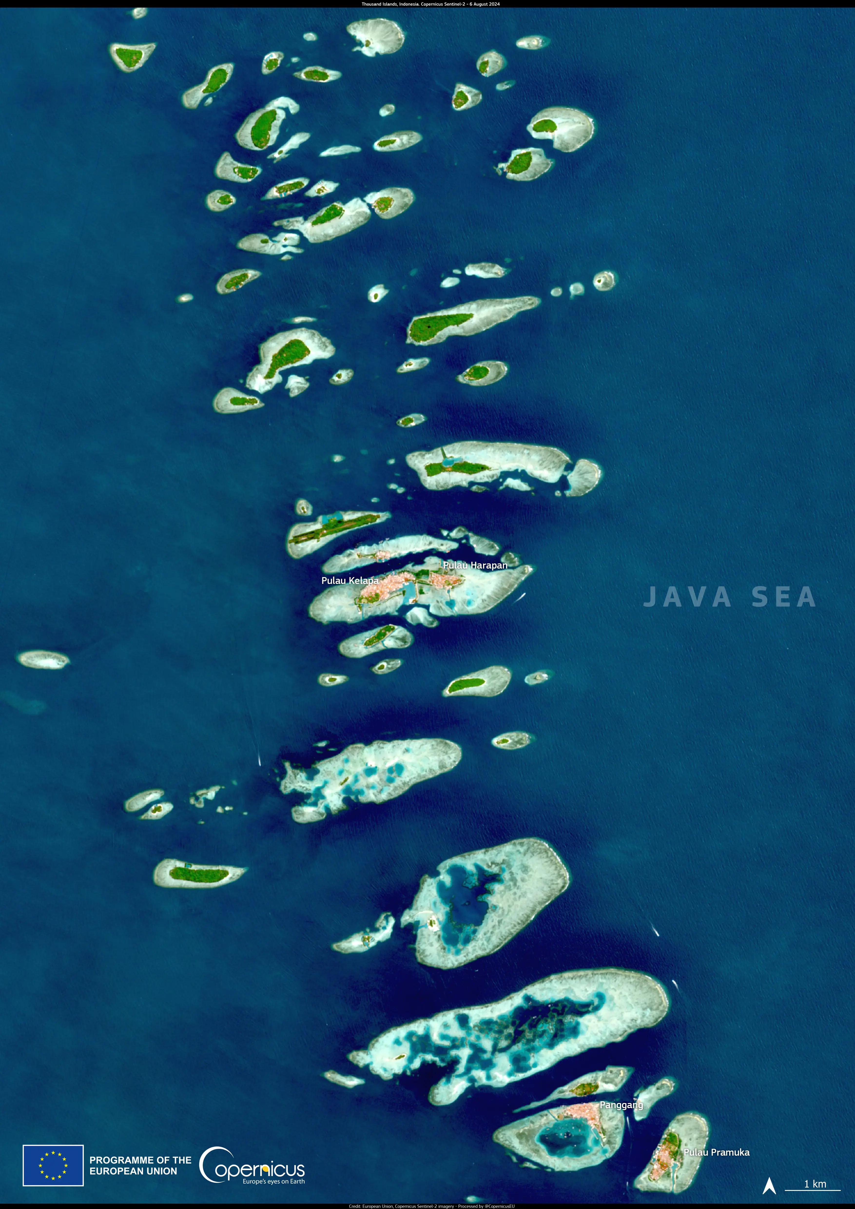 The Thousand Islands, or Kepulauan Seribu, visible in this image acquired by one of the Copernicus Sentinel-2 satellites on 6 August 2024, is an archipelago off the coast of Jakarta, Indonesia.