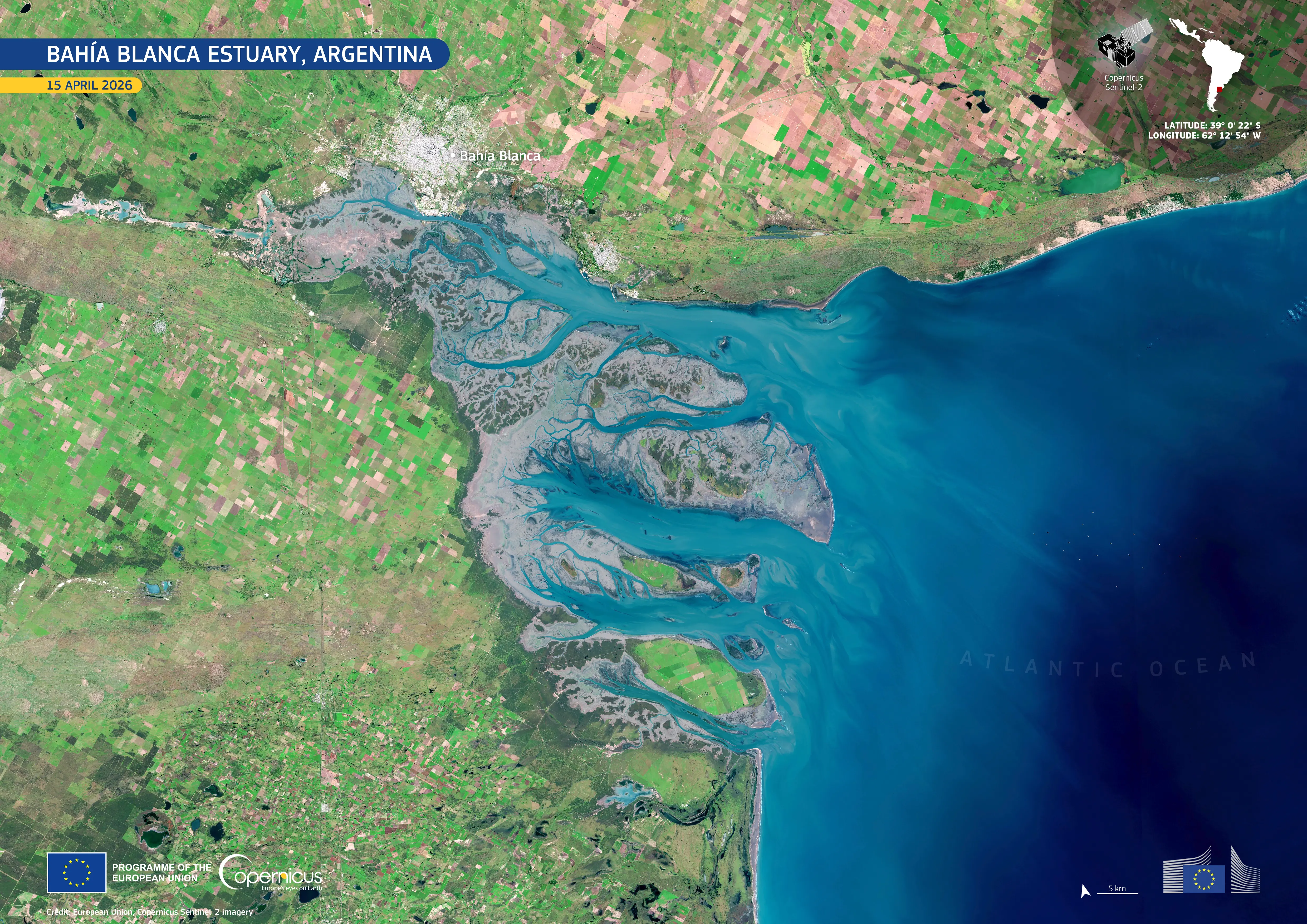 This image, acquired by one of the Copernicus Sentinel-2 satellites on 15 April 2026, shows intricate branching waterways cutting through extensive grey-blue mudflats. Turquoise tones in the estuarine channels indicate the presence of suspended sediments, while the deep blue of the Atlantic Ocean provides a marked contrast offshore. Surrounding agricultural land forms a mosaic of bright green and pale brown fields, while the urban area of Bahía Blanca is visible to the north.
