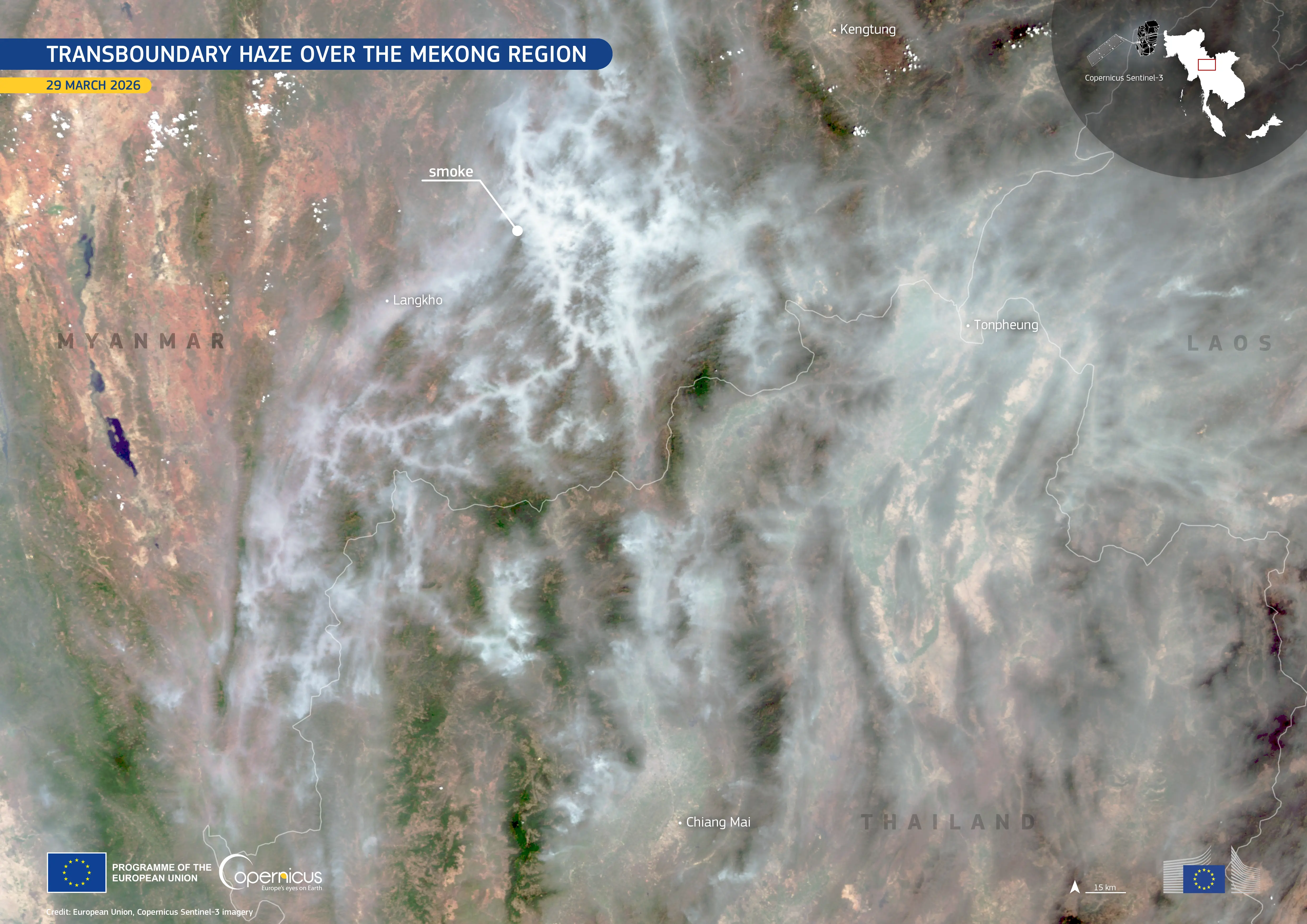 This image, acquired by one of the Copernicus Sentinel-3 satellites on 29 March 2026, shows dense smoke plumes spreading across the border region between Myanmar, Thailand, and Laos. Valleys and ridgelines channel the smoke, causing it to form elongated streaks across the landscape.