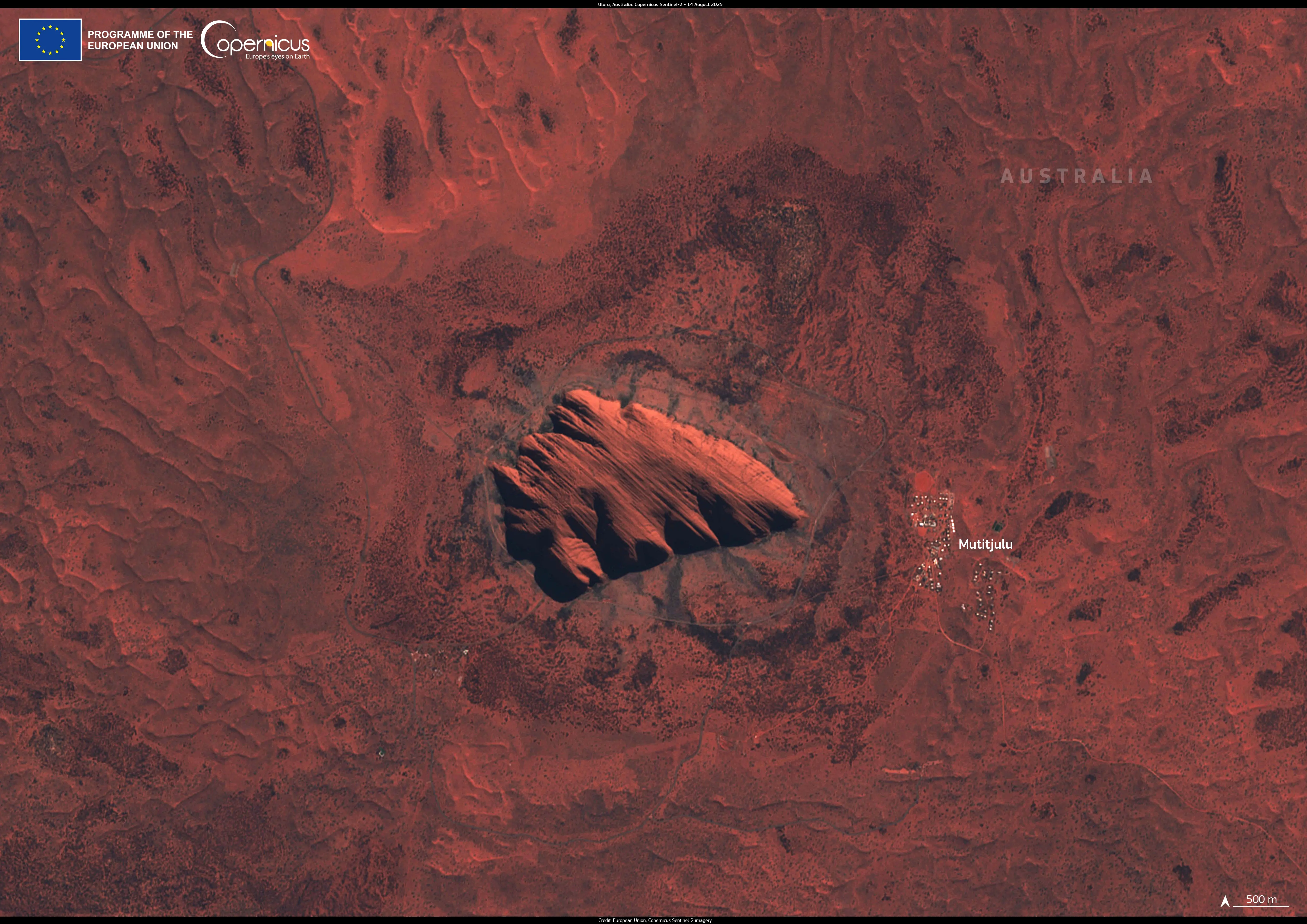 This Copernicus Sentinel-2 image, acquired on 14 August 2025, shows Uluru from above. Buildings of the Mutitjulu Aboriginal community are visible to the east of Uluru.