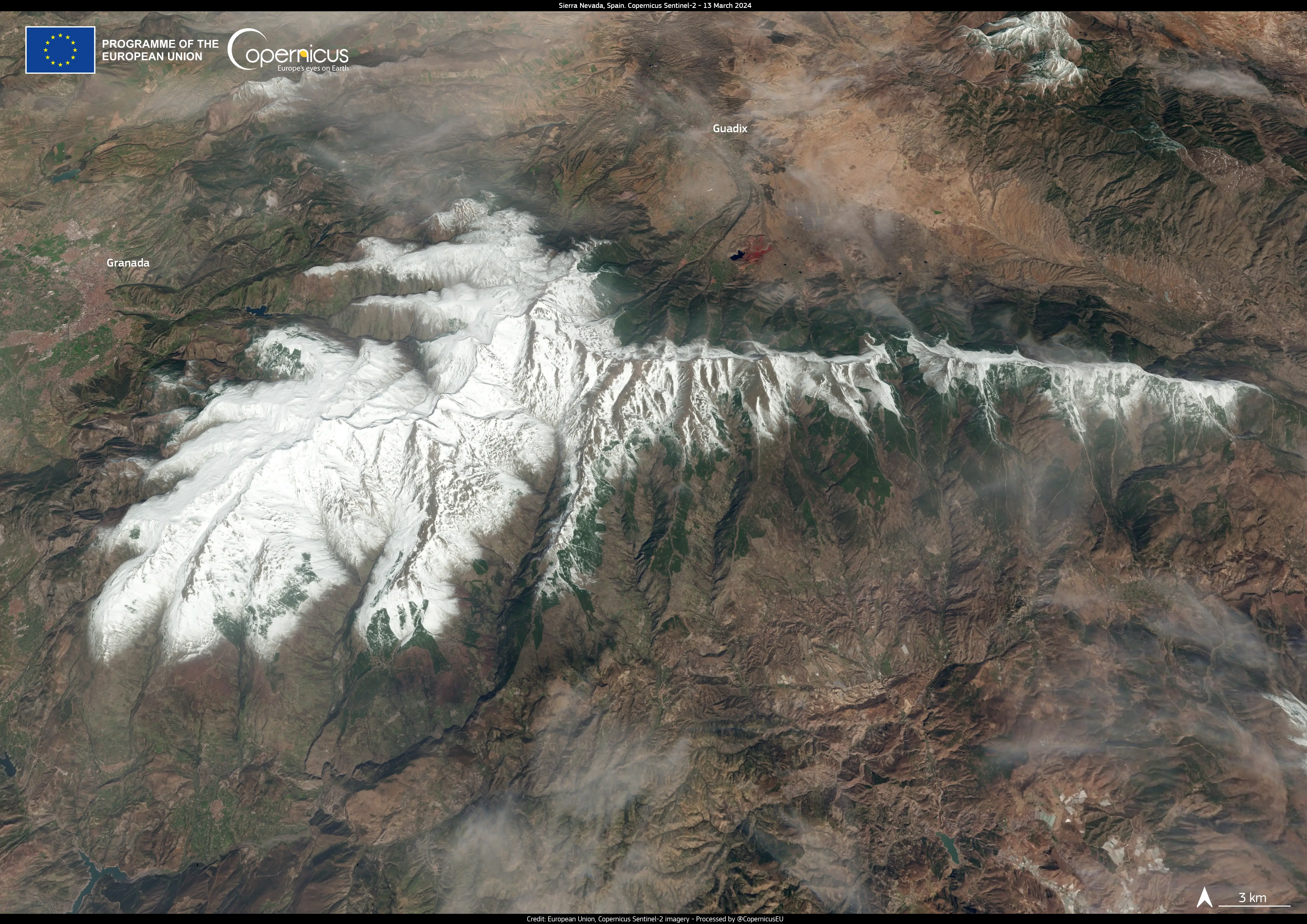 This image, acquired by one of the Copernicus Sentinel-2 satellites on 13 March, shows the snowy Sierra Nevada mountains.