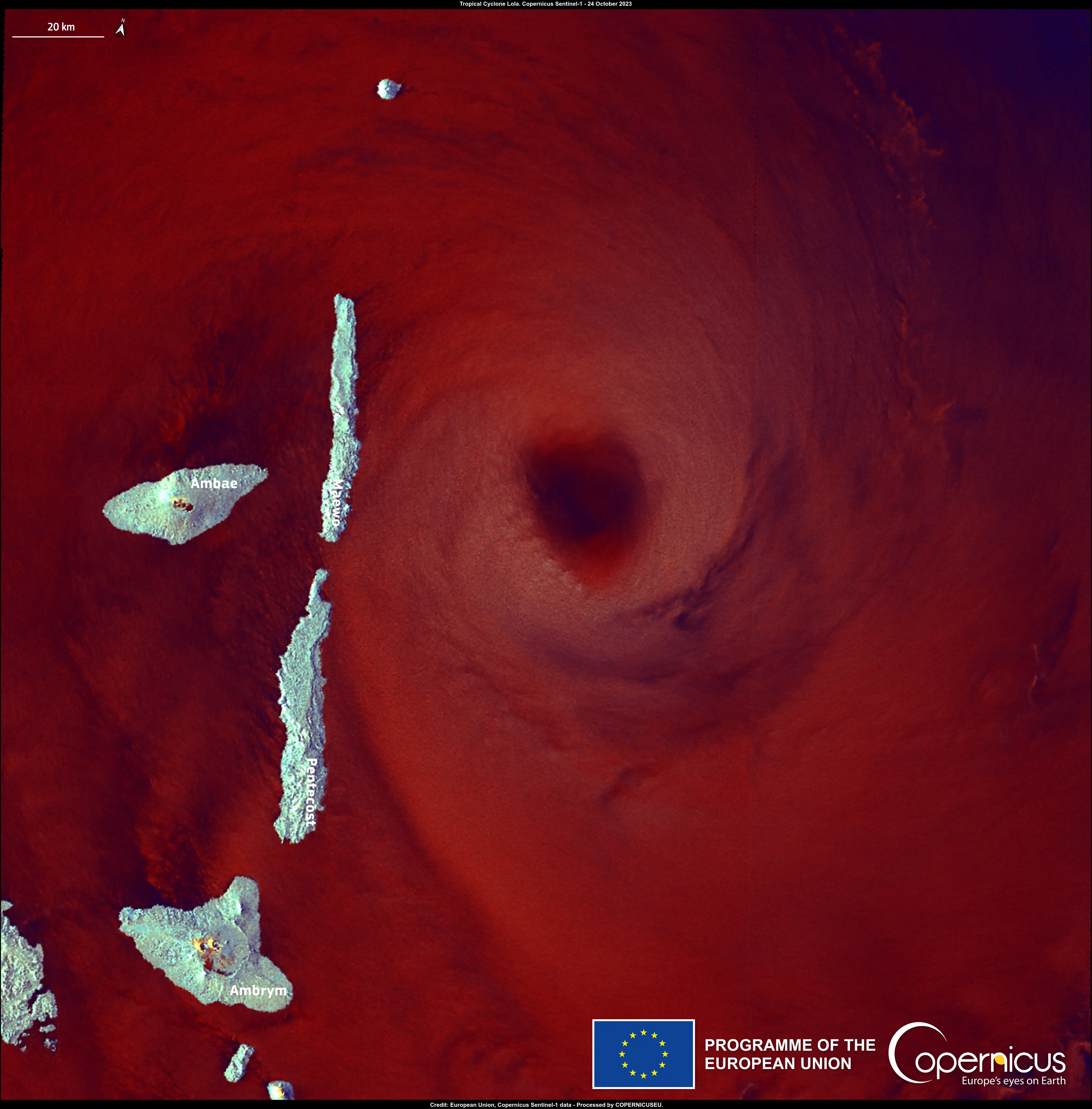 This Copernicus Sentinel-1 radar image of Cyclone Lola, acquired on 24 October, shows the eye of Lola east of Maewo Island.