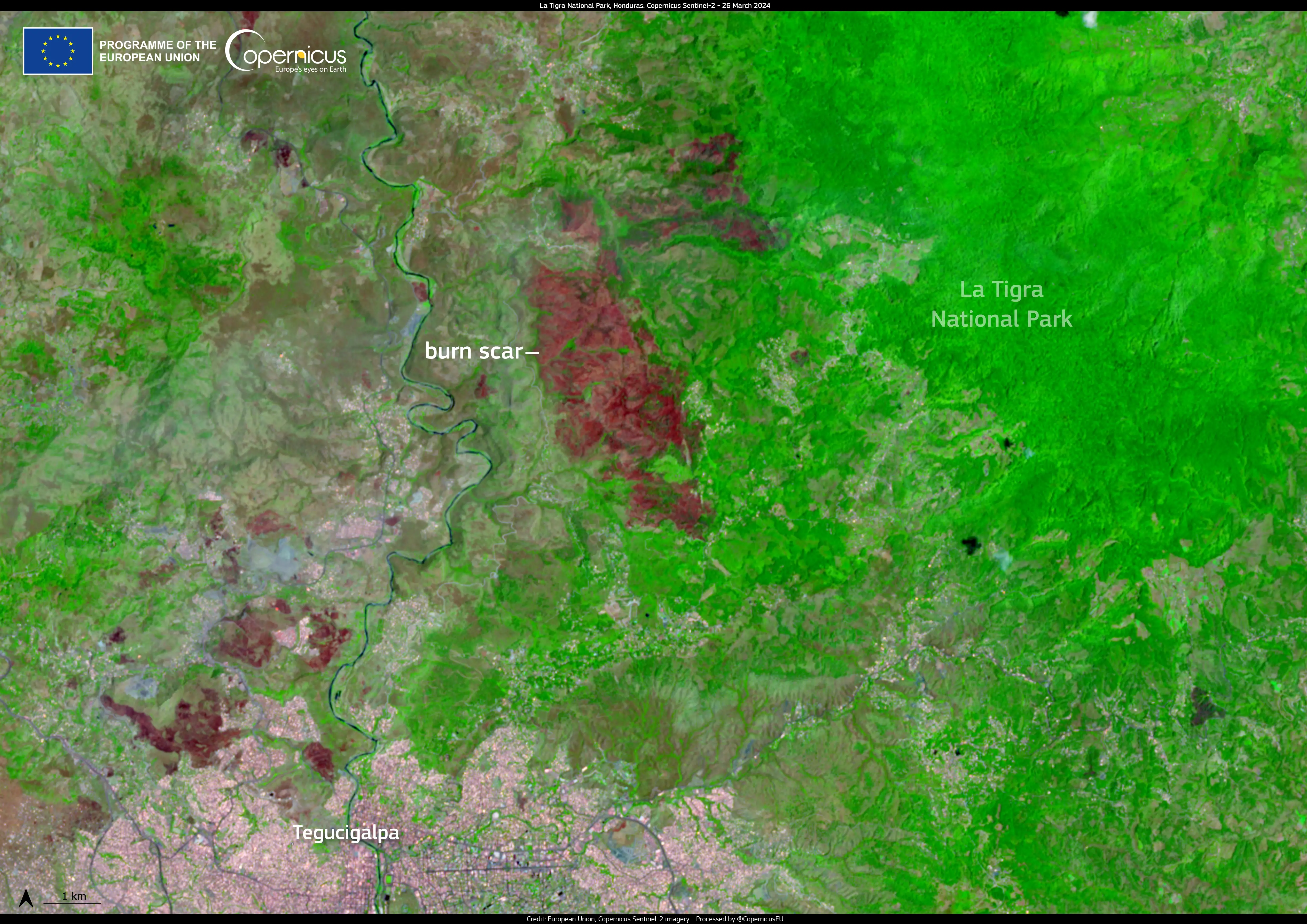 The burn scar of the fire is visible in this Copernicus Sentinel-2 image acquired on the same day.