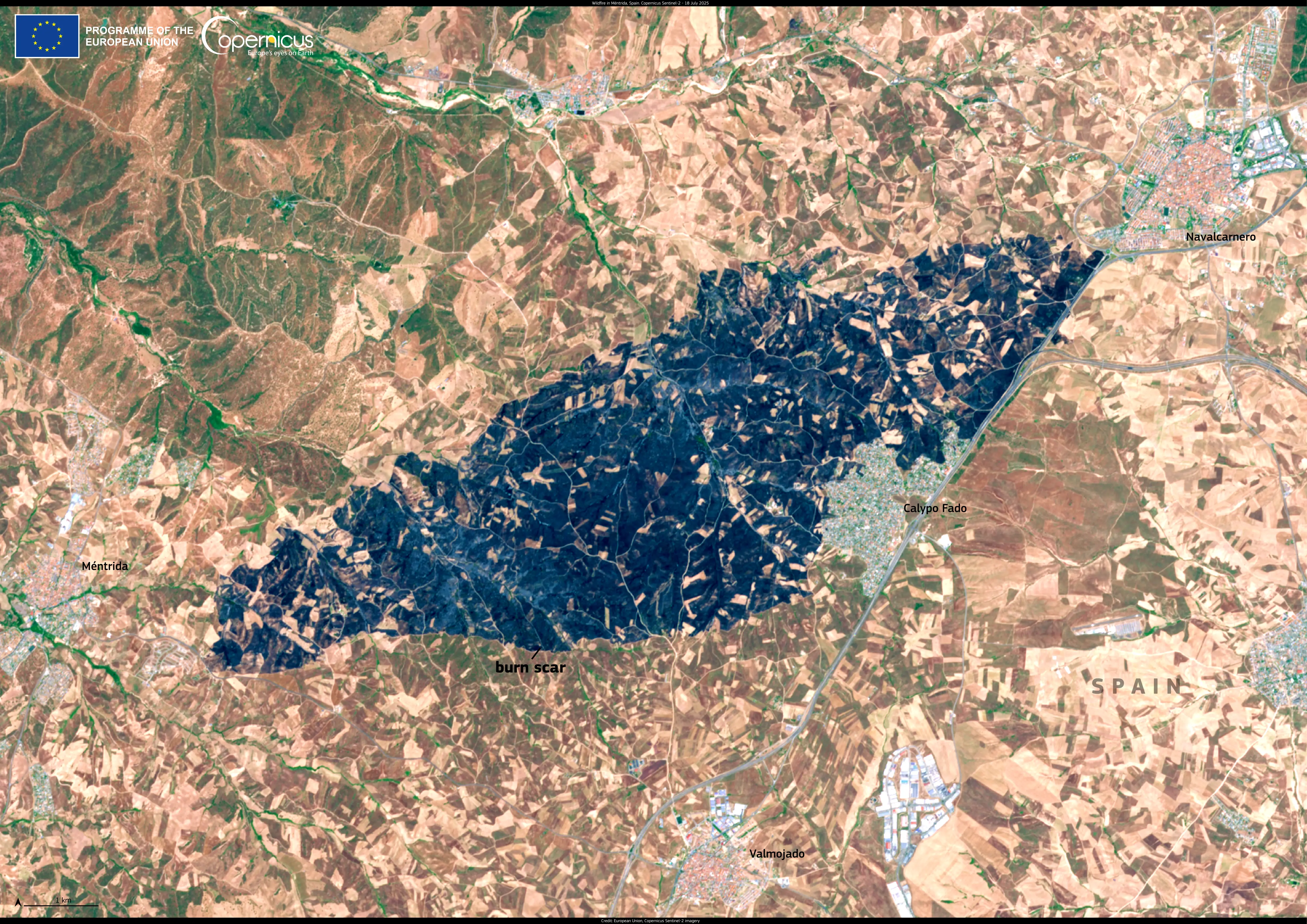 This image, acquired by one of Copernicus Sentinel-2 satellites on 18 July 2025, shows the burn scar caused by the fire.