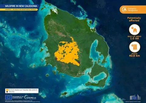 On 30 November 2025, a wildfire broke out on the island, spreading toward the town of Vao. The Copernicus Emergency Management Service (CEMS) was activated (EMSR852) to deliver emergency mapping for wildfire extent estimation.