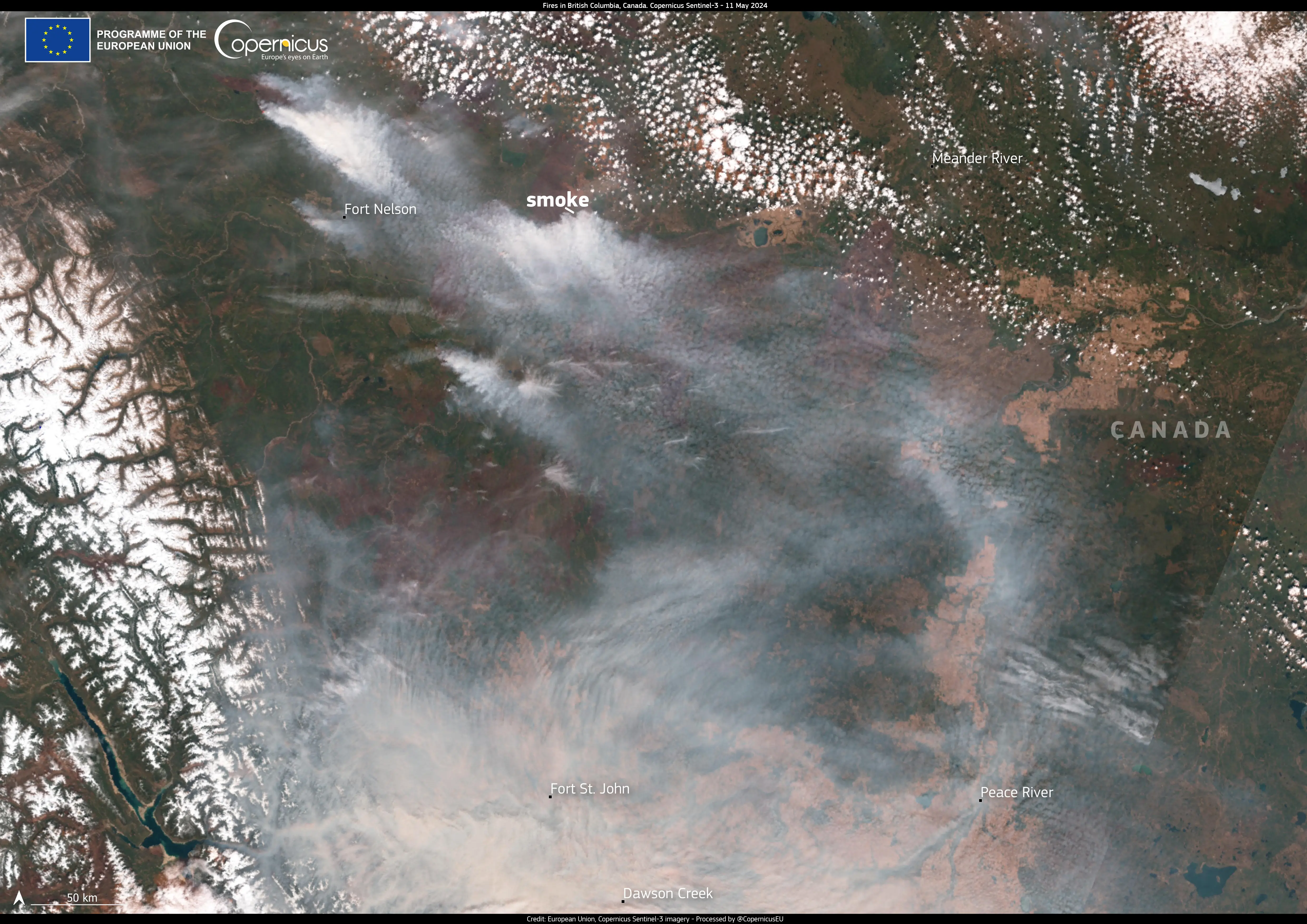 The smoke clouds generated by the fires near Fort Nelson are visible in this Copernicus Sentinel-3 image acquired on 11 May 2024.