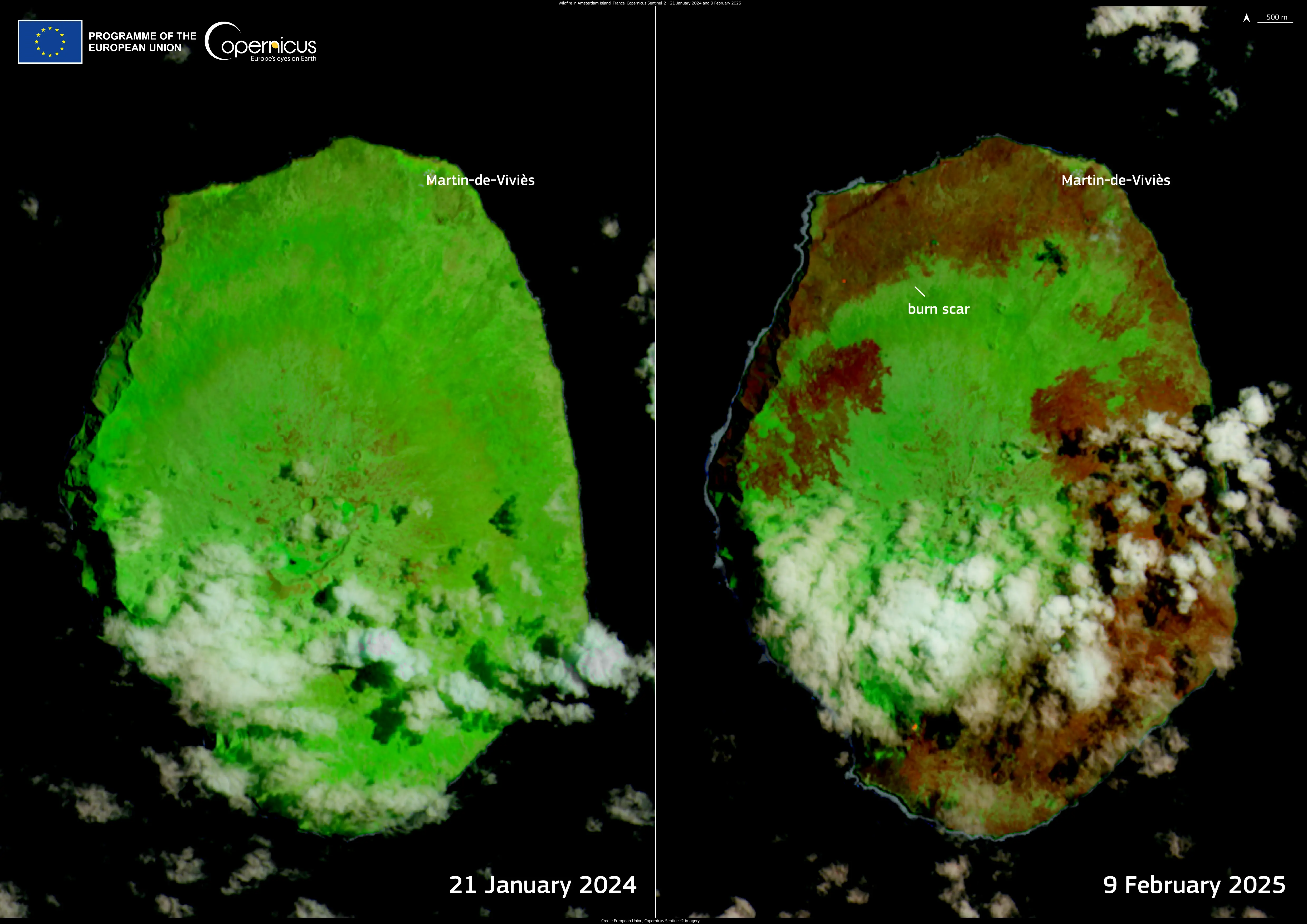 These Copernicus Sentinel-2 false colour images, acquired on 21 January 2024 and 9 February 2025, show the enormous extent of the burnt area on the Island.