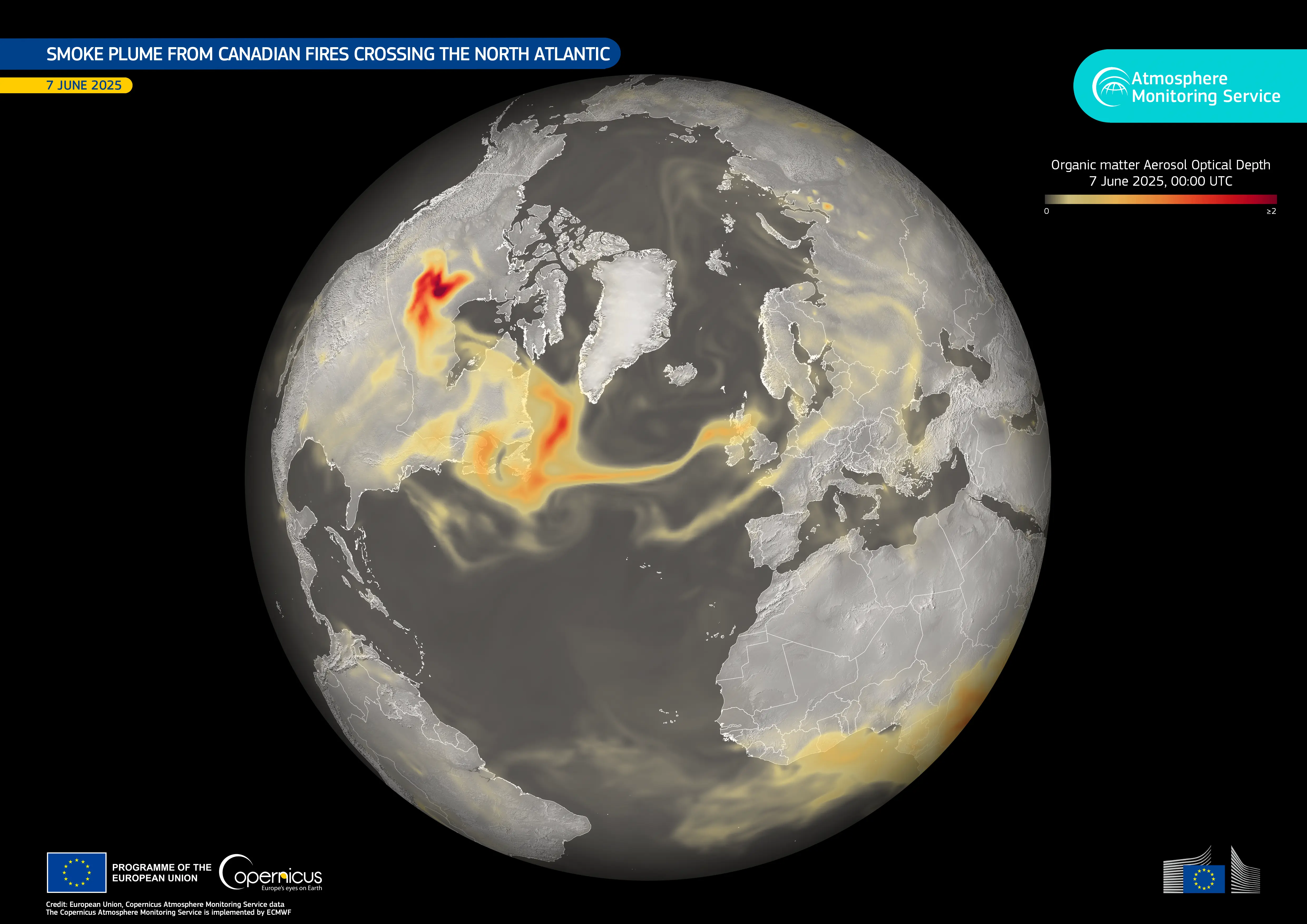 This data visualisation, based on Copernicus Atmosphere Monitoring Service (CAMS) data, shows smoke plumes travelling across the Atlantic and reaching Europe on 7 June 2025 at 00:00 UTC. According to CAMS, June and July 2025 saw severe wildfire activity in Canada, with daily total wildfire intensity and emissions consistently above the 2003-2024 average throughout the summer.