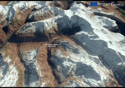 This image acquired by one of the Copernicus Sentinel-2 satellites shows the ski station of Gavarnie-Gèdre in the French Pyrenean on 30 January. The ski station will remain provisionally closed because of the snow drought.