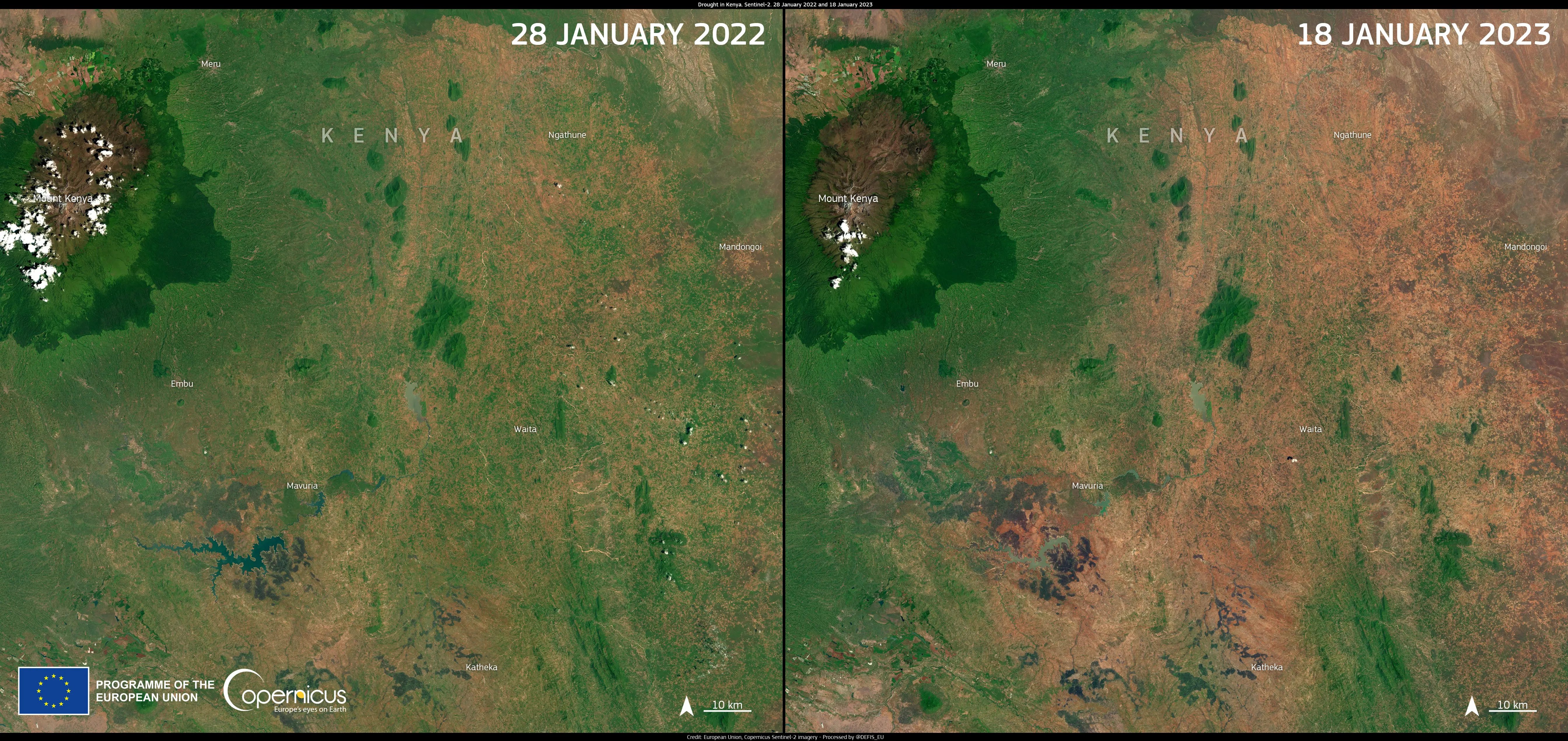 The combination of global warming and La Niña conditions are causing a food crisis and water shortage in Somalia, Ethiopia, and Kenya. Over 1.3 million people have been forced to leave their homes and seek food in other locations. The situation may worsen in the coming months with a forecast of a sixth consecutive below average rainy season. Copernicus Sentinel-2 images show the impact of the ongoing drought on central Kenya, one of the hardest-hit regions.