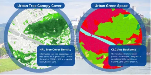 The Copernicus Land Monitoring Service (CLMS) is poised to play a key role in meeting this challenge by providing freely available, standardised datasets which cover the entire European Union at high spatial resolution. CLMS datasets are mentioned by name in the text of the NRR in two separate places, in the context of the ‘urban green space’ and ‘urban tree canopy cover’ indicators. Urban Green Space is defined as, “the total area of trees, bushes, shrubs, permanent herbaceous vegetation, lichens and mosses, ponds and watercourses found within cities or towns and suburbs...” while Urban Tree Canopy Cover is defined as, “the total area of tree cover within cities and towns and suburbs.”