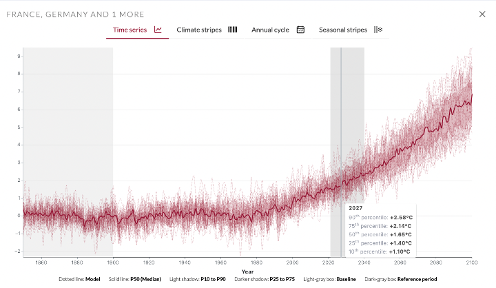 The Atlas also contains different datasets about the past. It includes observations like the E-OBS gridded observational database, which tracks the temperature in Europe since 1950. It also offers reanalyses from ERA5 and ERA5-Land, which give climate information from as far back as 1940 for ERA5 and 1950 for ERA5 Land, up to 2022.