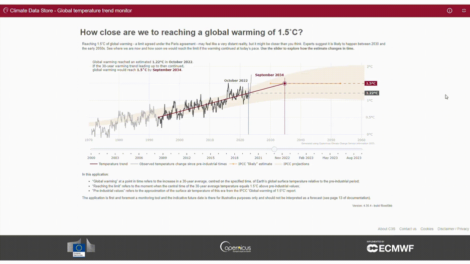 This application is your window into understanding the pace of temperature change compared to the pre-industrial era. It includes a sliding scale to explore data from 2000 to the present. The visualisation is clear and compelling, with a red line extending into the future, marking the average rate of warming over the past 30 years until it reaches the critical 1.5°C limit.