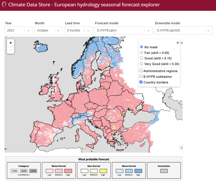 The European Hydrology Seasonal Forecast Explorer is useful if you want to explore river discharge across Europe. The interactive map within the app lets you explore the most likely river discharge forecasts provided by selected hydrological models, indicating whether conditions are expected to be above, near or below normal. By simply clicking on a specific grid point or catchment, you can access a more detailed visualisation and gain a comprehensive understanding of river discharge forecasts.